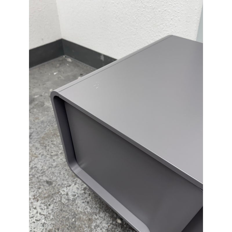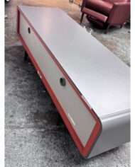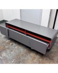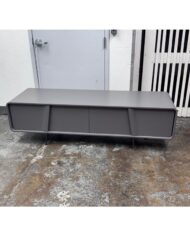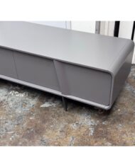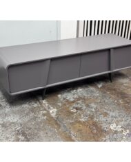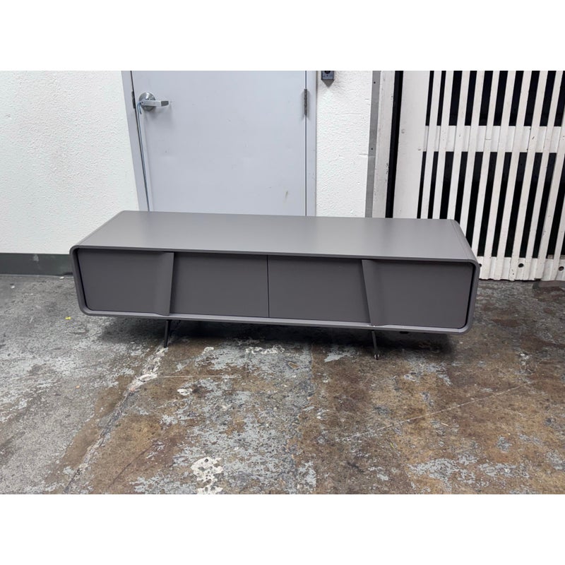 Design Plus Gallery presents the Musa TV Stand by ALF DaFrè. The Musa furniture collection offers versatile options for various needs, whether as a tv stand, sideboard, cabinet, or display cabinet. Its standout feature lies in the rounded shape of its carcass, giving it a distinctive aesthetic appeal. The sloping cut of the doors not only conceals the handle but also seamlessly extends into the lines of the painted metal feet, adding to its sleek design. The interior is lacquered offering both beauty and functionality. The design of the carcass creates a seamless illusion of a single surface with no visible joins and offers seamlessly integration of metal feet. There is visible wear present to the media unit, scratches not he surface and frame, but overall is in good condition for its usage. Made in Italy.