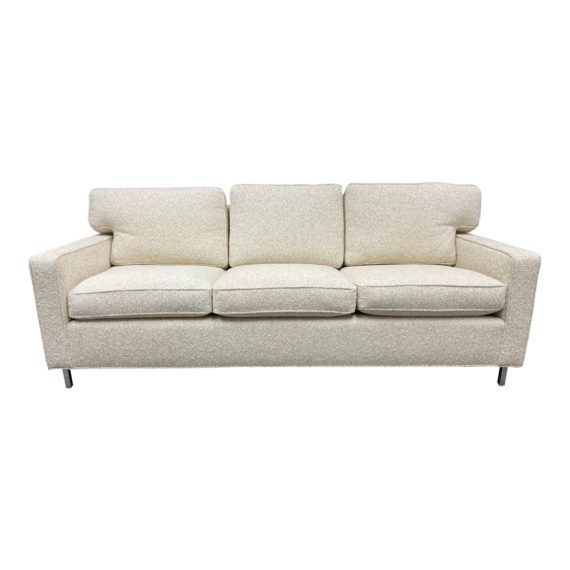 Design Plus Gallery presents a Custom Designed Three Sofa Sofa. Upholstered in a Nubby Cotton off-white upholstery. The legs are in a polished stainless steel finish. Consist of three on three loose cushions.