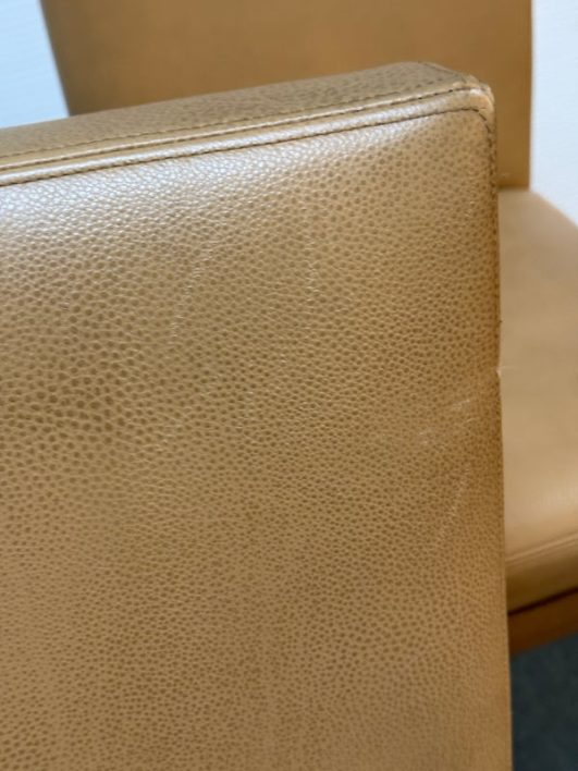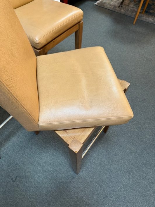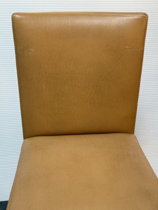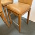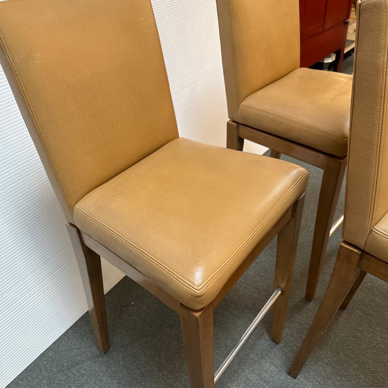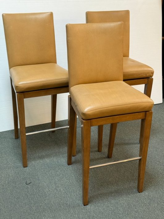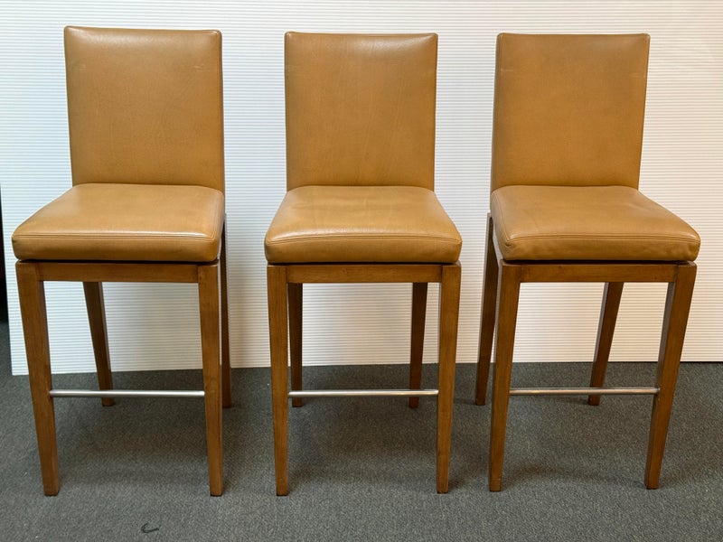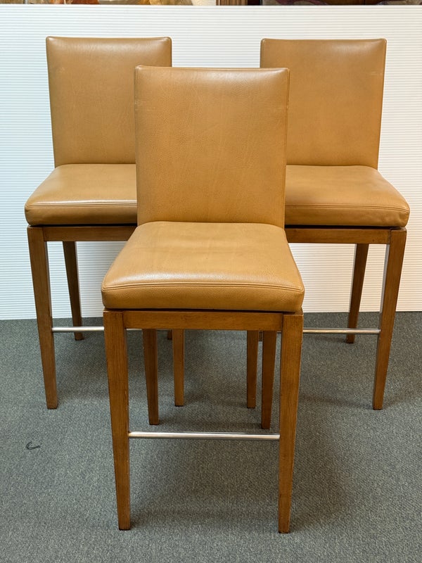 Design Plus Gallery presents a Custom Set of 3 No. 647 Barstools by A. Rudin. Simple in silhouette, luxurious in finishes, the trio are timeless. Soft Carmel leather wraps the cushioned seat and back in comfort, while warm finished frame supports elegantly. Return to position swivel adds ease and function. Light surface wear; nicks and scratches on legs; condition is consistent with age and use.