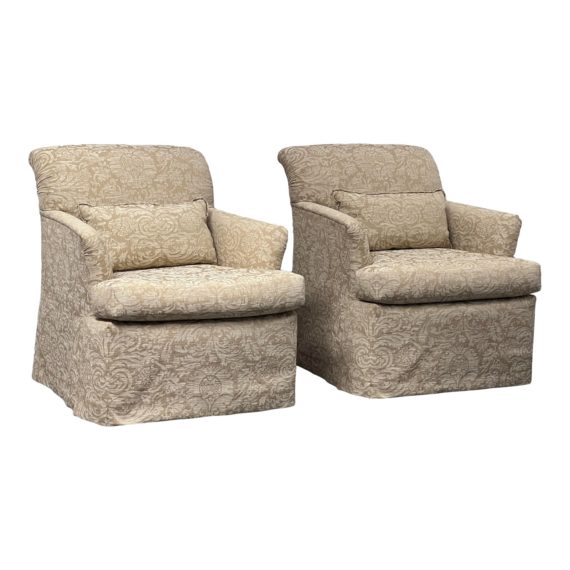 Design Plus Gallery presents a Pair of Custom Champagne Swivel Lounge Chairs from A. Rudin. Reupholstered by Kroll Furniture. The fabric has a floral pattern that is tonal of cream and gold, turning it into a neutral champagne. The chairs are completely upholstered all around the frame with no exposure to any of the wood frame. They swivel and offer a lumbar pillow for comfort and ease of movement. Both are in good condition with wear that is consistent with age + use. Made in USA.