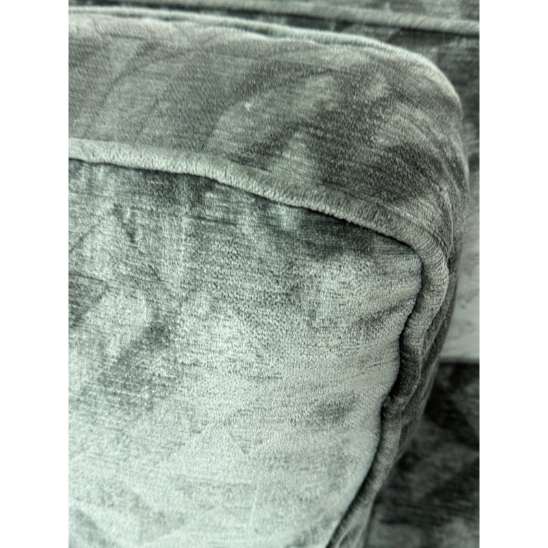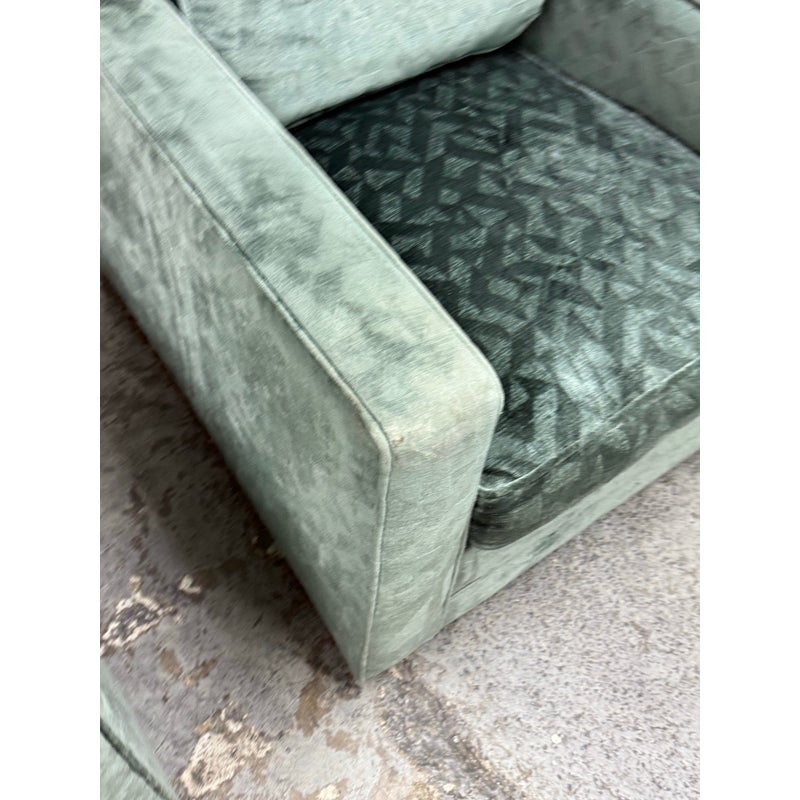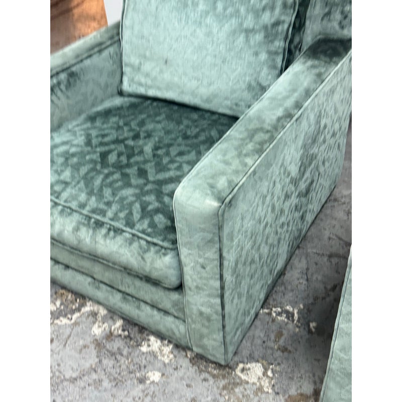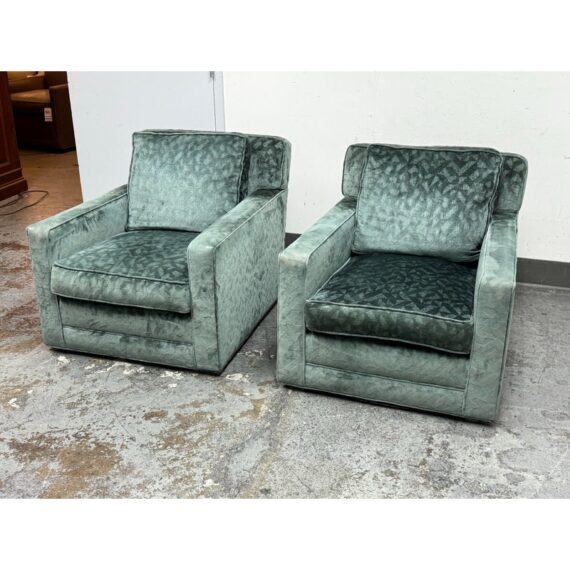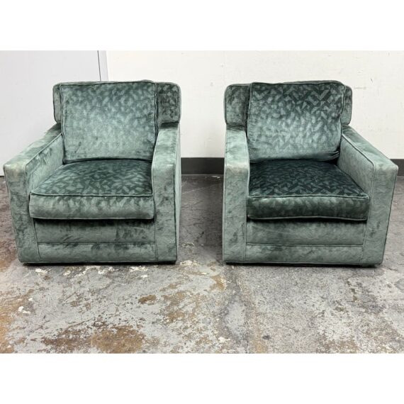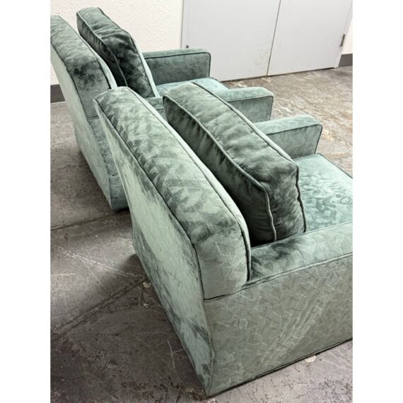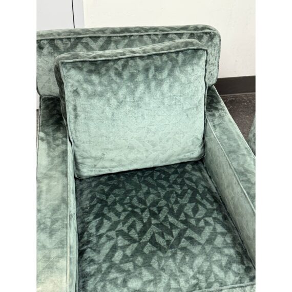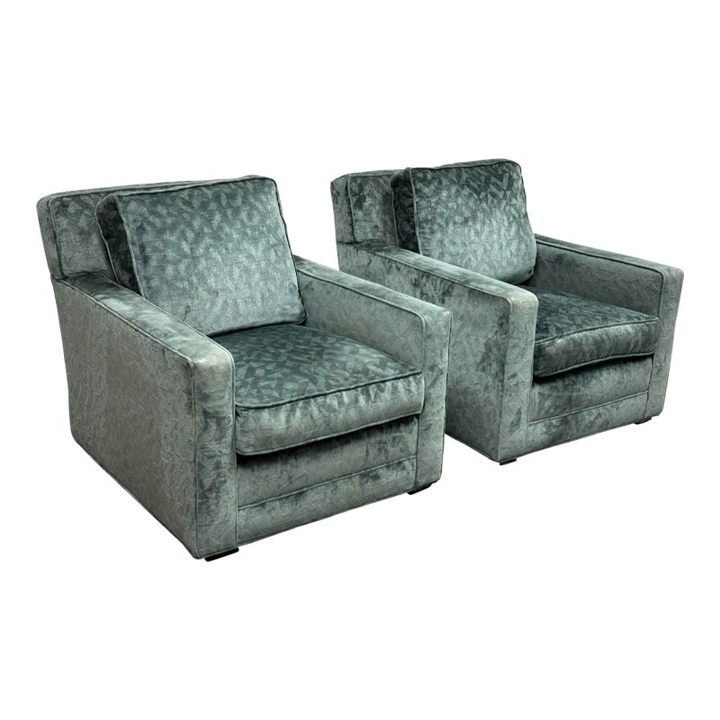 Design Plus Gallery presents a Pair of Sage Green Velvet Lounge Chairs from A. Rudin. Gorgeous upholstery awaits your home with a classic, formable chair of classic proportions. Each chair has plush cushions that are densely filled with premium waterfowl feathers and polyester fiber: The jewel tone of sage green has a tonal design pattern and is luxurious silk velvet wrapped. Both reupholstered are in good condition with visible and minimal surface wear for their usage. Makers mark removed. Made in the USA.
