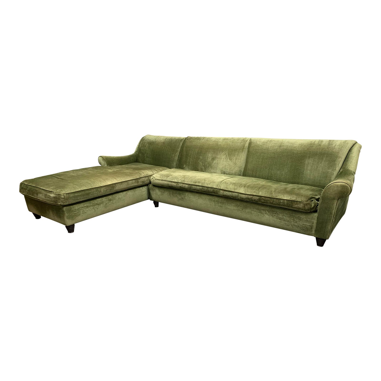 Design Plus Gallery presents an A. Rudin Rolled Arm Green Chenille Sectional. Rich green is densely patterned with brown shagreen like texture. Traditional detailing like turned legs and sloped high back and arms add sophistication to the modern craftsmanship of the generous seating arrangement. Fabric has visible wear and loose wiping a few areas. Visible stains, including a blue ink stain the size of a quarter.