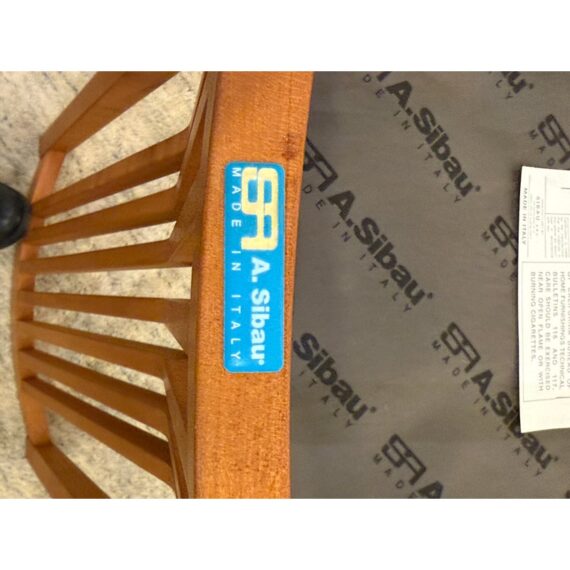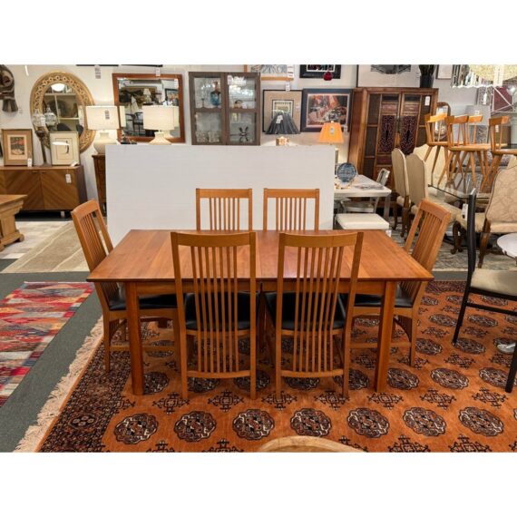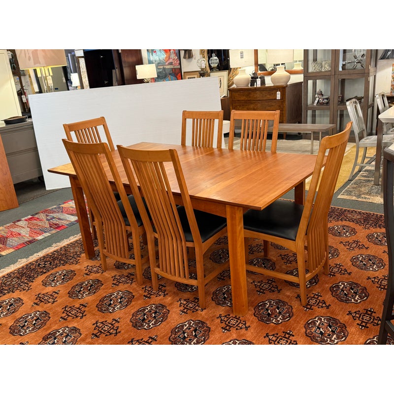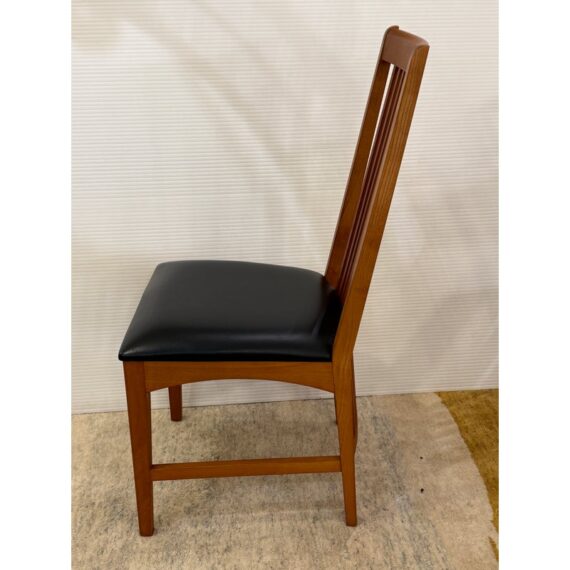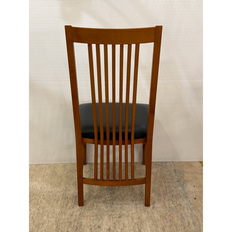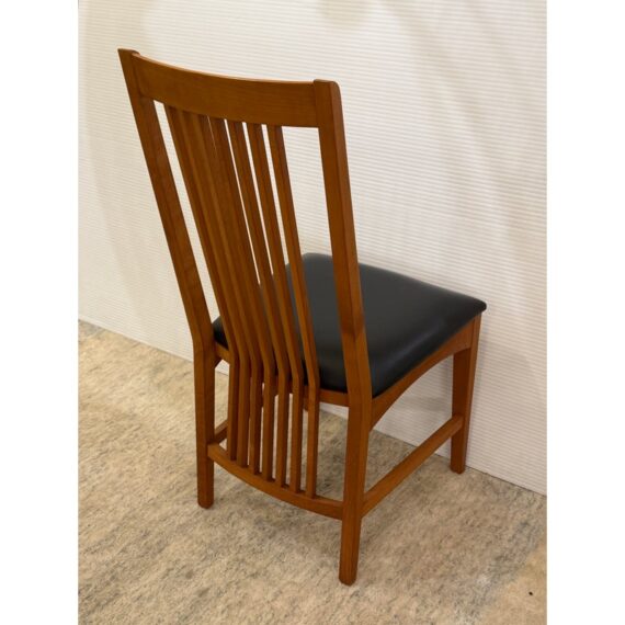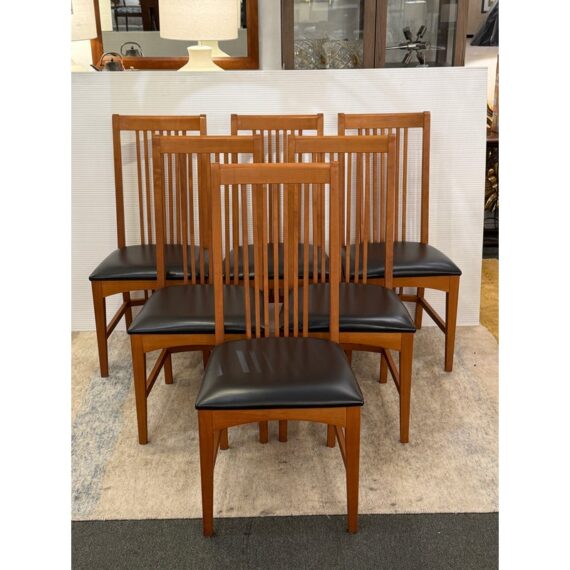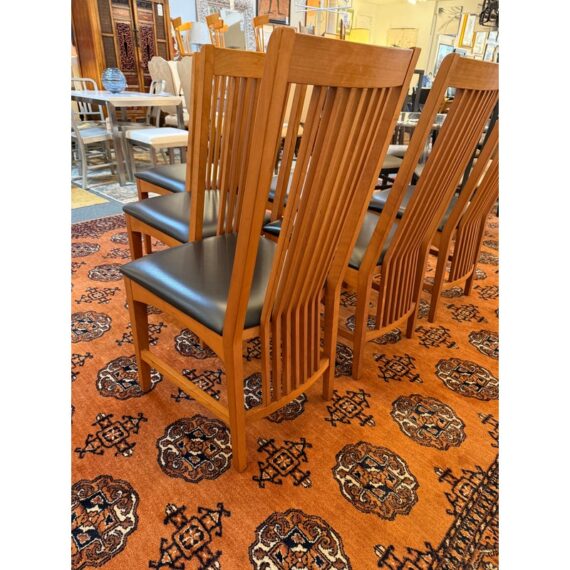 Design Plus Gallery presents a Set of Eight Cherry Wood Dining Chairs from Antonio Sibau. These distinctive chairs are crafted from solid cherry woods with architectural slat back that lightly reference the Arts & Crafts movement of the mid 20th century. This set is inclusive of side chairs and their seats are upholstered in cushioned black leather. Minor wear from usage, consistent with age and use. Made in Italy.