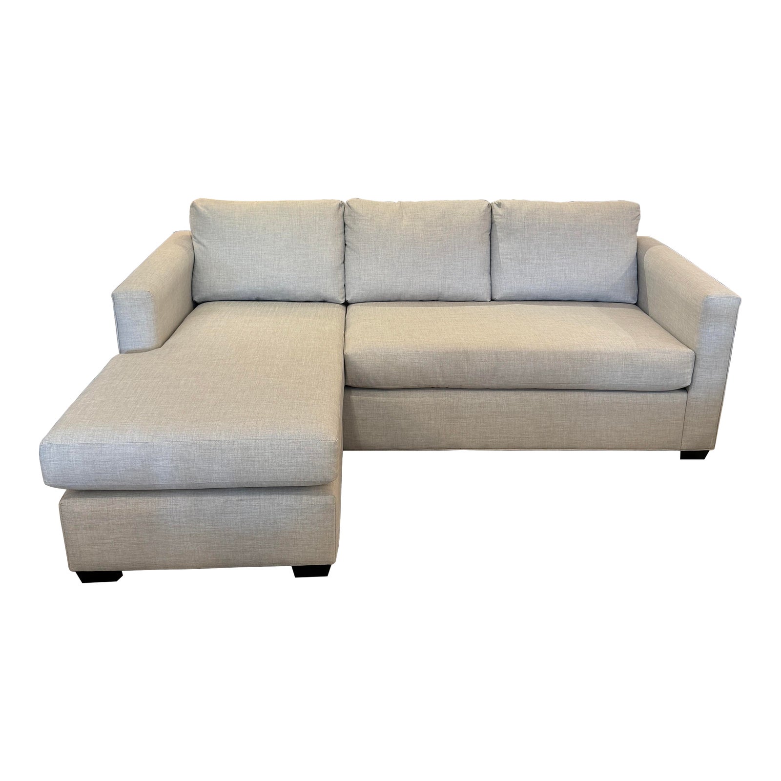 Design Plus Gallery presents a contemporary Sofa + Reversible Chaise. Clean lined silhouette in performance woven upholstery is a perfect fit in many spaces. Simply move the ottoman, flip the long cushion, and voila! The chaise moves to the other side to fit in a different space. Low tapered wood legs support the two pieces. Little wear; condition is good for age and use.