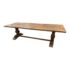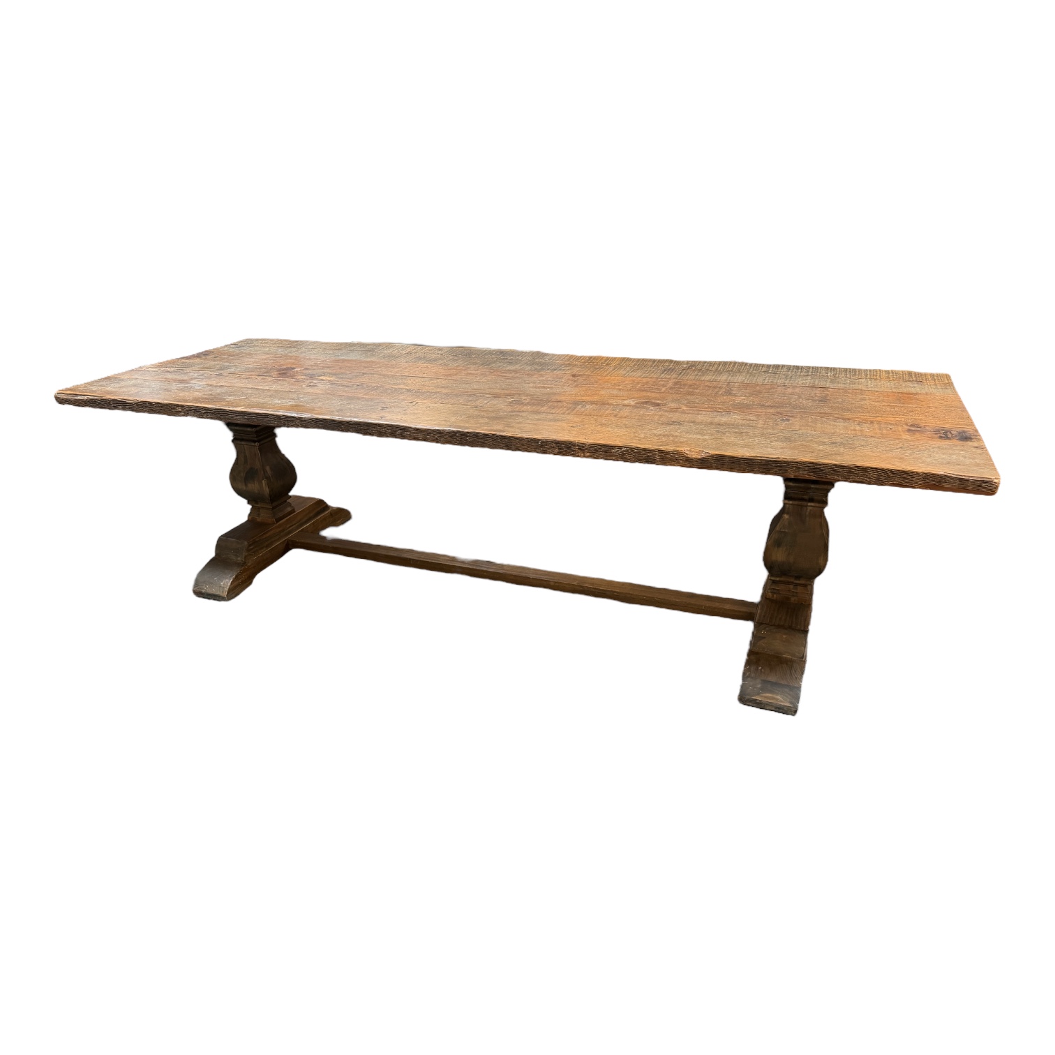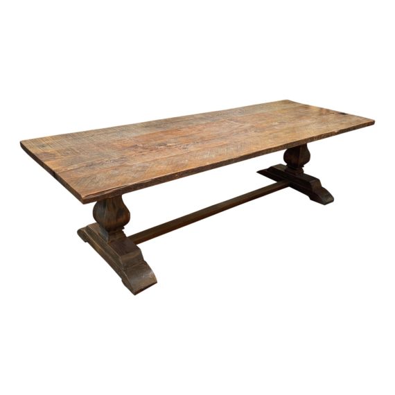 Design Plus Gallery presents a Custom Rustic Trestle Table by ABC Carpet & Home. The table’s double baluster pedestal base supports the long expanse of distressed wide planks. Wonderful woodgrain, uneven edges, knots and saw marks all add to your modern farmhouse vibe. Intentional distressing, table is in good condition for age and use.