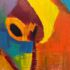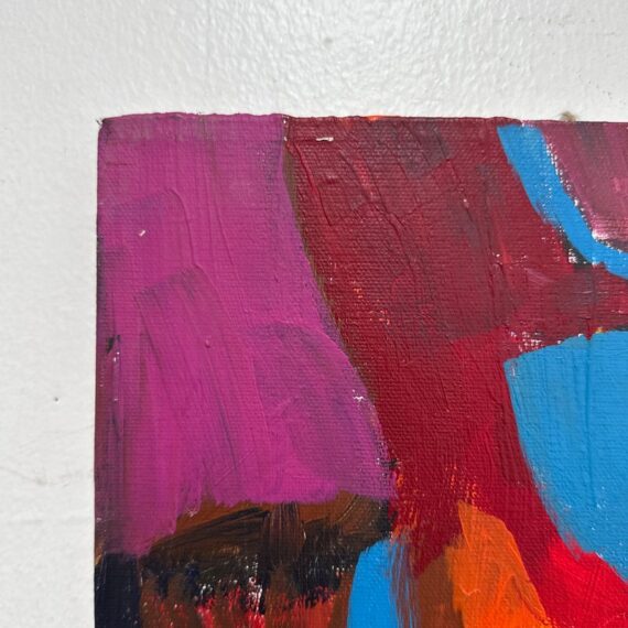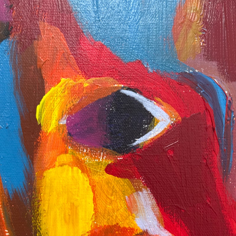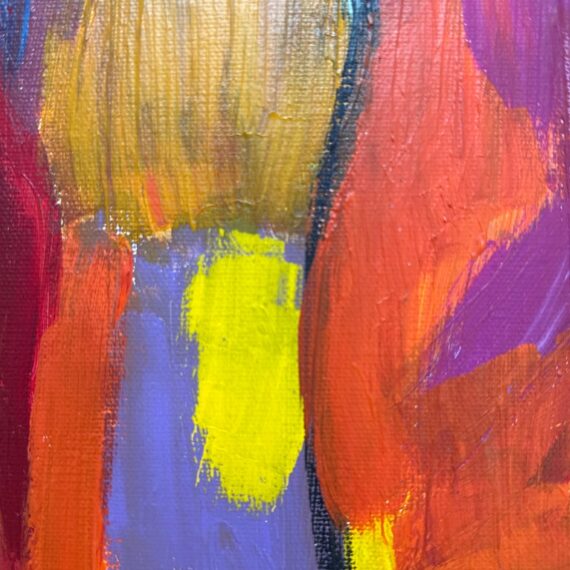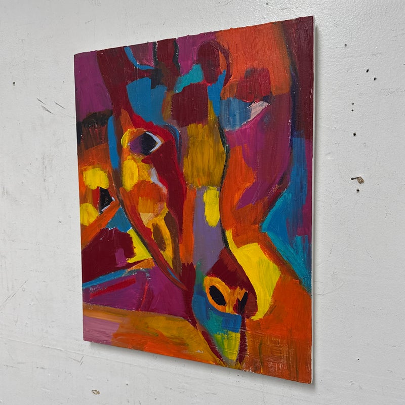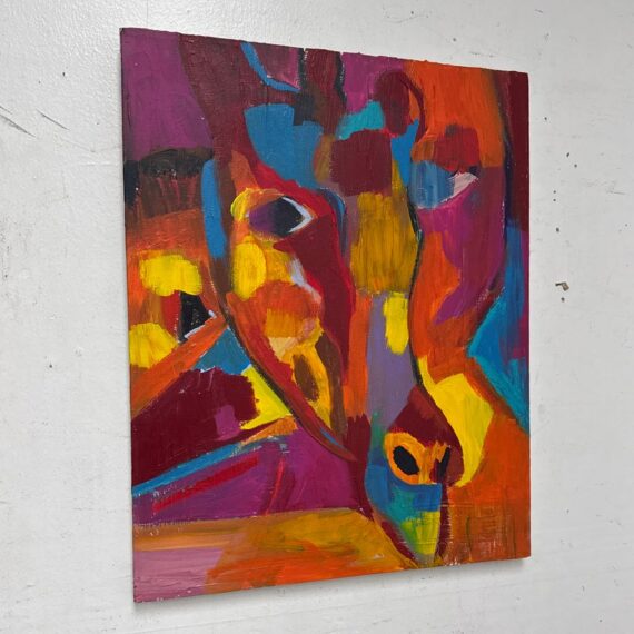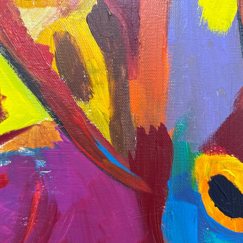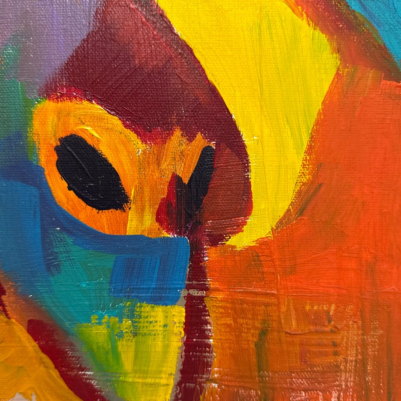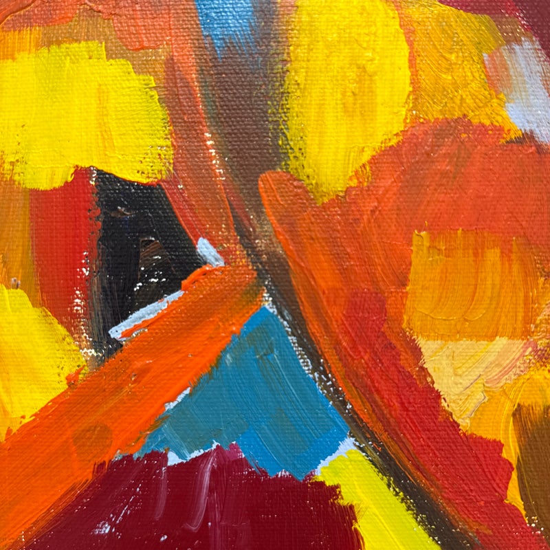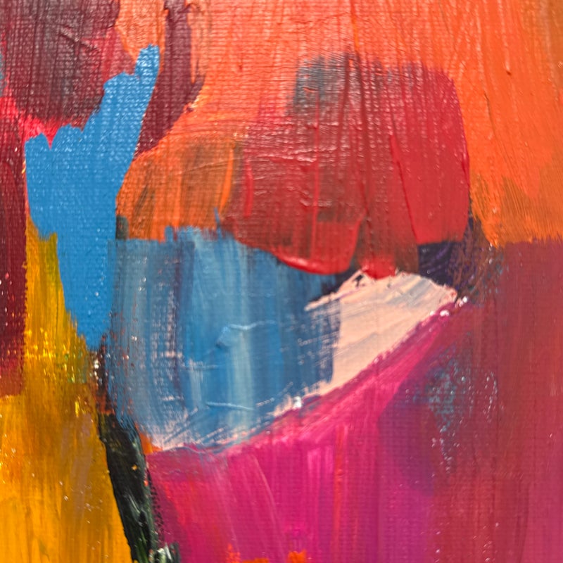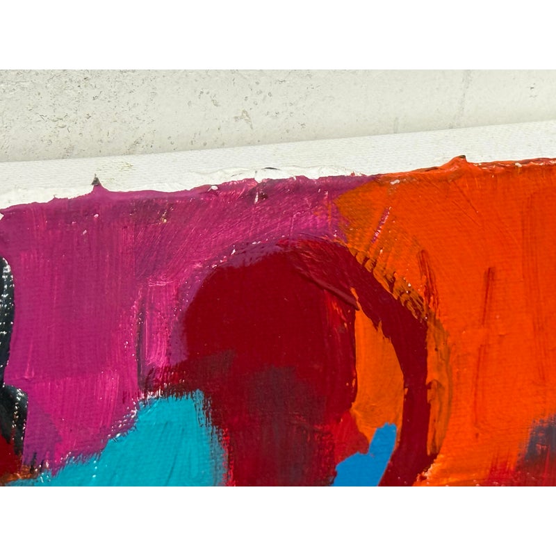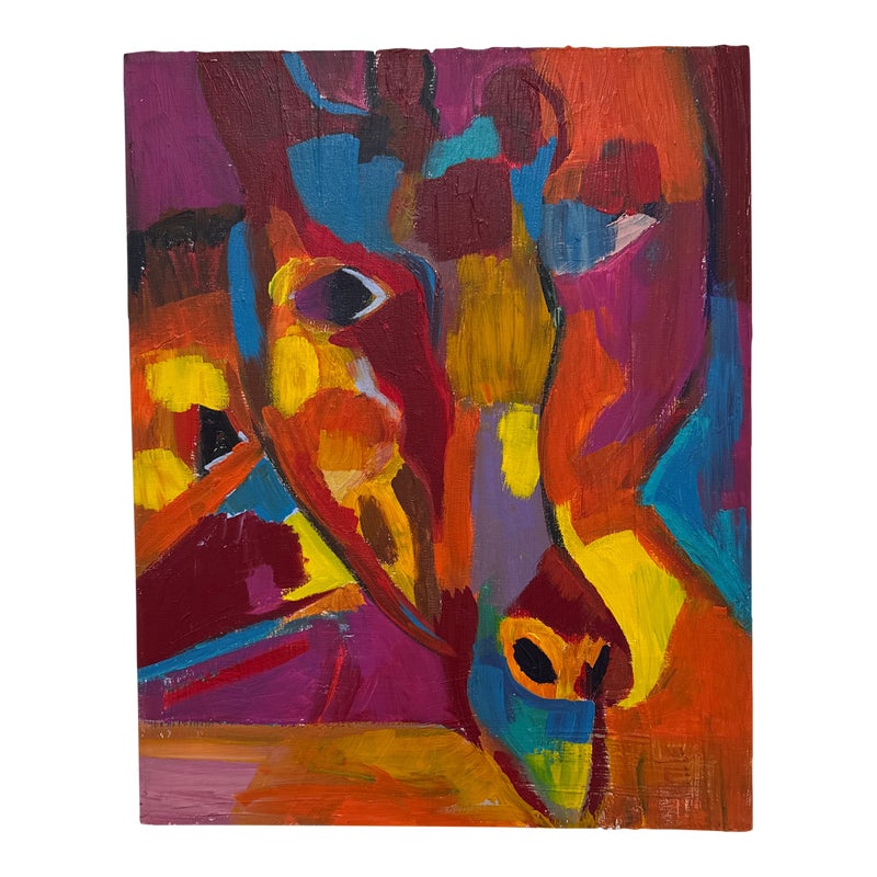 Design Plus Gallery presents a Highly Saturated Abstract Painting Entitled, Face. The artist and date of the artwork are unknown, medium is acrylic on stretched canvas. The colors are swirling around its entirety. The colors are gem like with magenta, turquoise, bright yellow, flame orange mixing in every which way. Overall is in good condition for its usage.