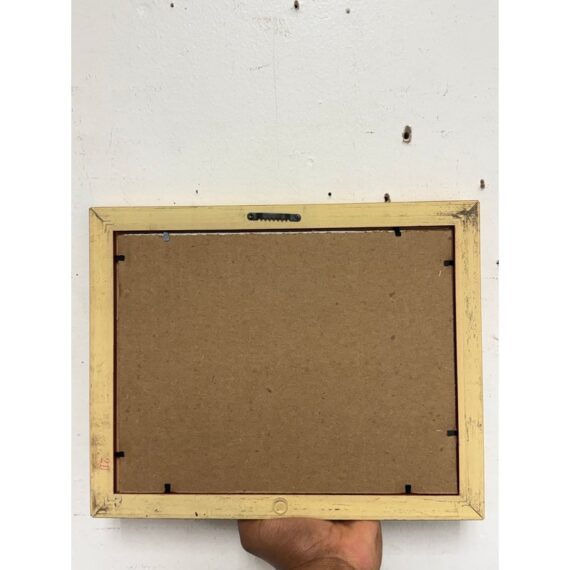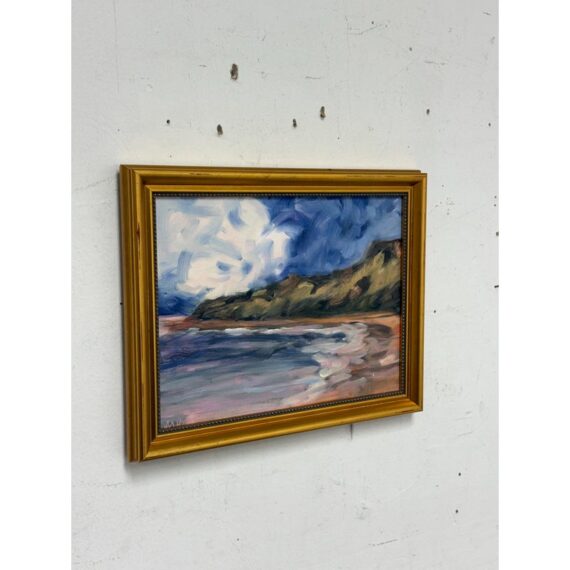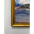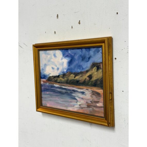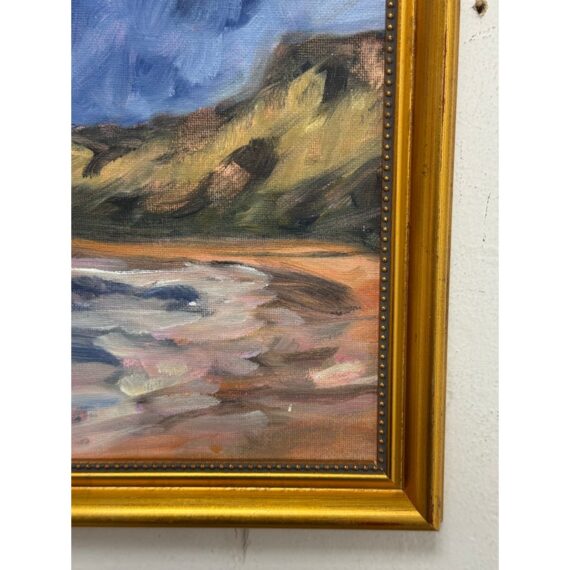Design Plus Gallery presents a Framed Painting of a Beach Scene. The abstract look of a cove on a sandy beach is presented here with blue skies and an overcast of white coming into its horizon. The beach has an embankment to which the waves come in and out from. The artwork is not signed and encased in a golden frame. It is in good condition overall with wear that is consistent with usage.