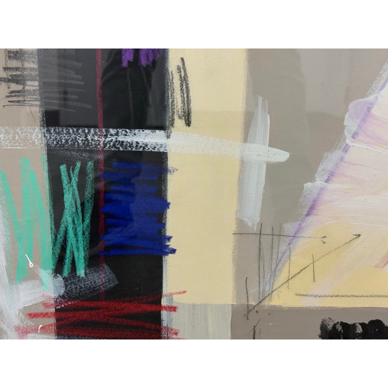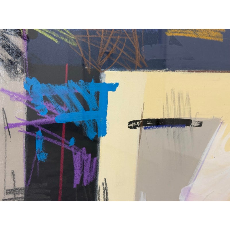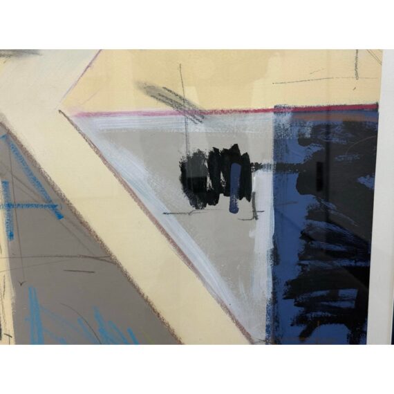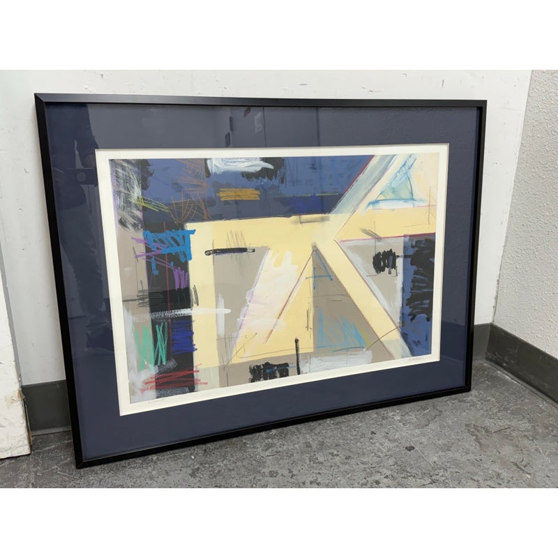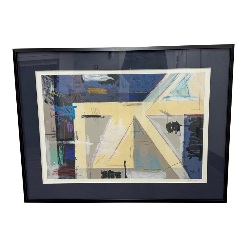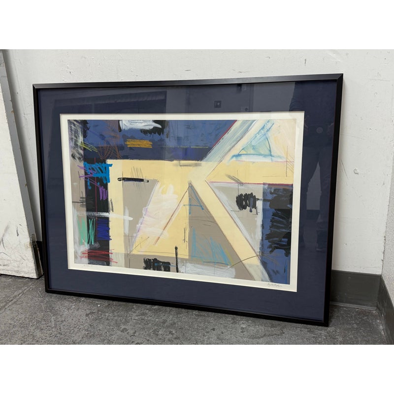 Design Plus Gallery presents a Signed + Titled Artwork of an Abstract Artwork. The architectural piece has juxtaposed shapes with elemental fragments around the entirety of the art piece. The appearance of this abstract resembles a building with its use of color + shapes, plus the title at the bottom in pencil looks to say “Builder”. Also, signed in pencil with a black frame + matte. Is in good condition with minimal wear for its usage.