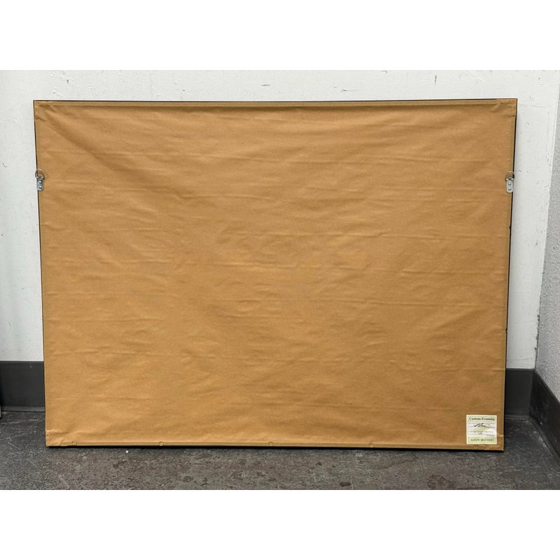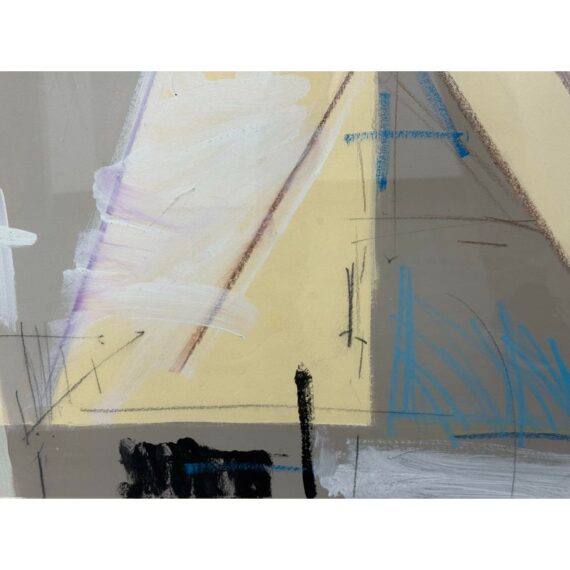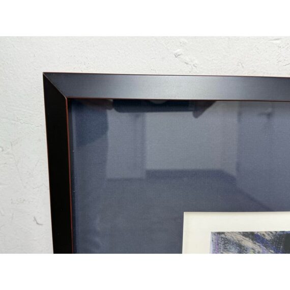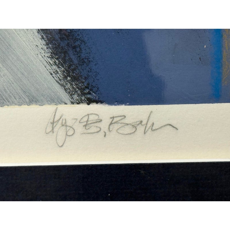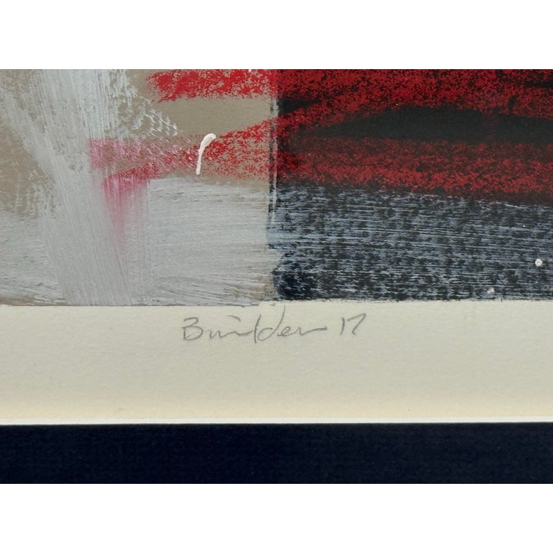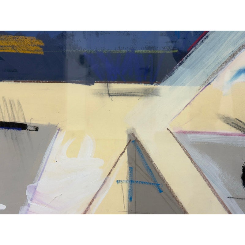 Design Plus Gallery presents a Signed + Titled Artwork of an Abstract Artwork. The architectural piece has juxtaposed shapes with elemental fragments around the entirety of the art piece. The appearance of this abstract resembles a building with its use of color + shapes, plus the title at the bottom in pencil looks to say “Builder”. Also, signed in pencil with a black frame + matte. Is in good condition with minimal wear for its usage.
