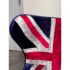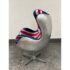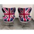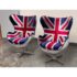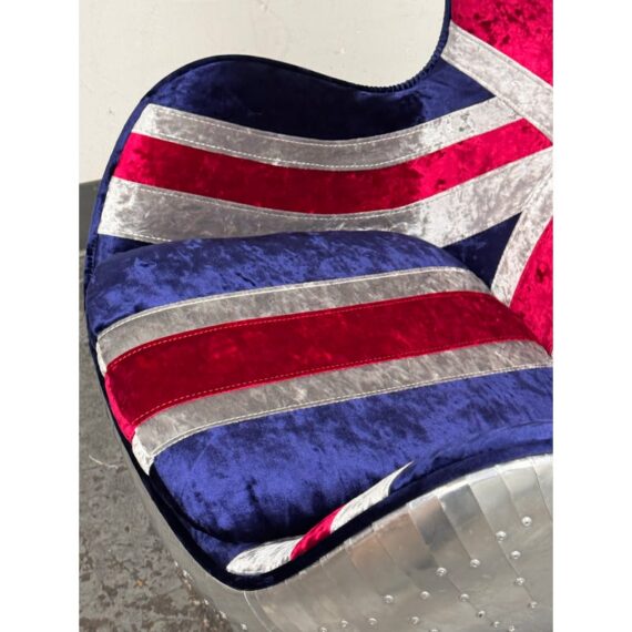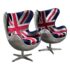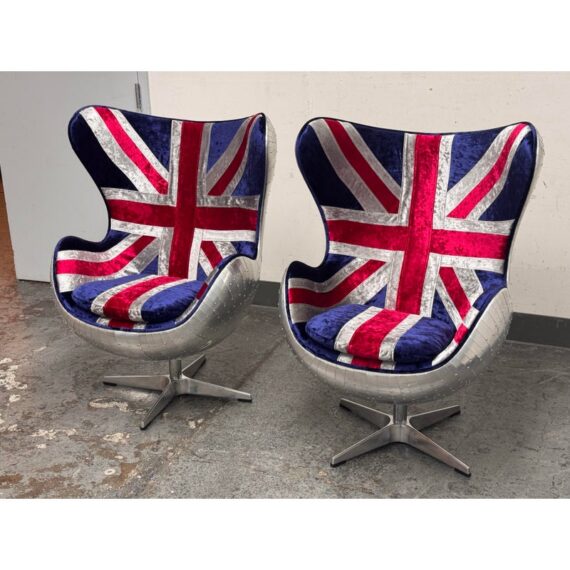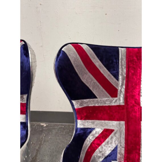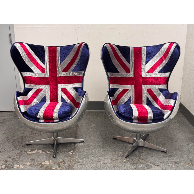 Design Plus Gallery presents a Pair Union Jack Accent Chairs from Acme Furniture. The chairs are inspired by Arne Jacobsen’s Egg Chair and are distinctive due to their sculptural wingback silhouette. Emboldened with plus velvet print Union Jack upholstery and accented with silver metallic insets to highlight the graphic pattern. The contoured seats include a removable cushion for added comfort and a tailored look. The exterior shell is wrapped in riveted metal panels that echo vintage aviation design, and the chairs are supported by a polished metal pedestal with a four point base. They are in good condition with visible and minimal wear from usage.