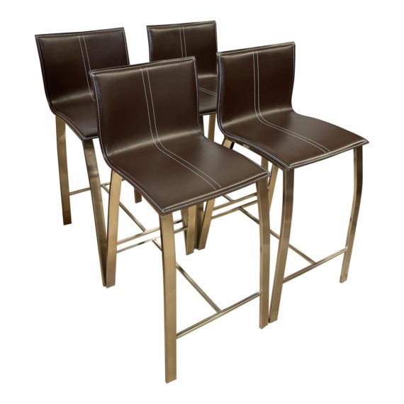 Design Plus Gallery presents a Set of Four Jeanet Counter Stools by Actona Company. Espresso bonded leather with white stitch scoops seats. The bases are a brushed steal. Designed in Denmark, made in China.