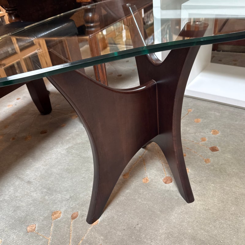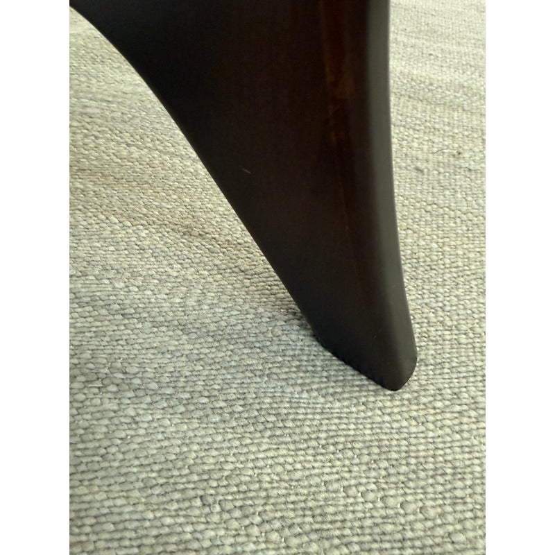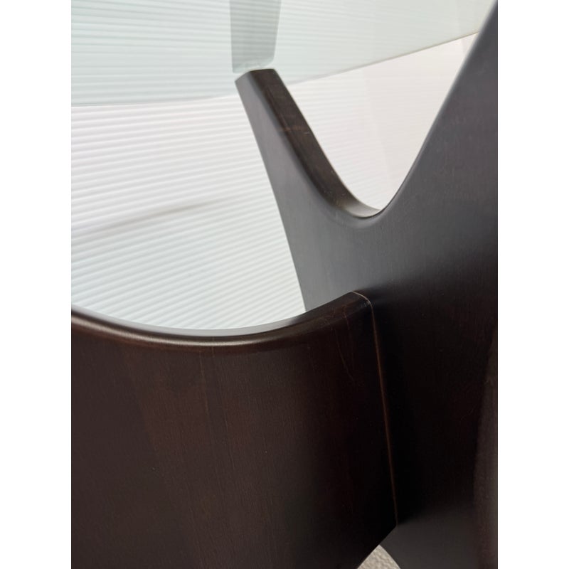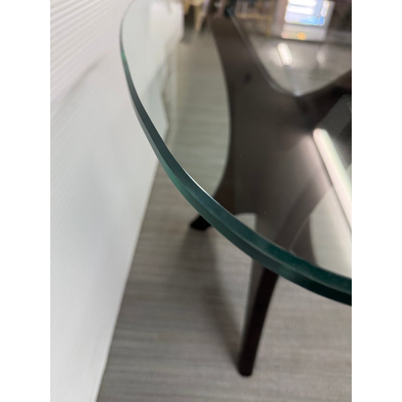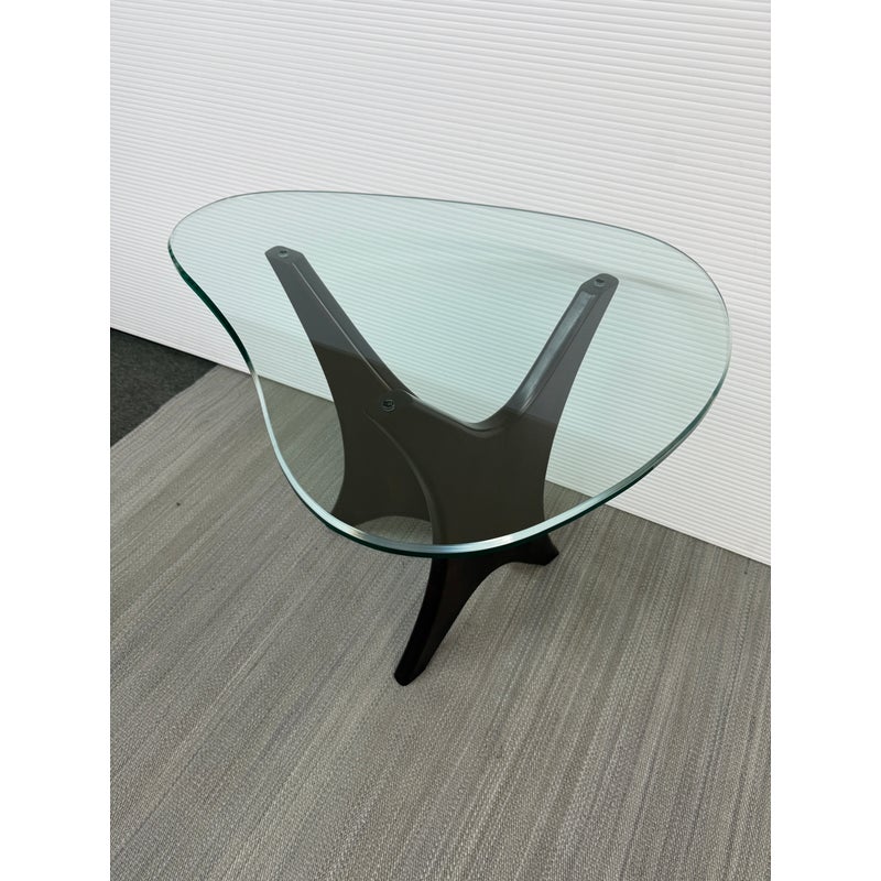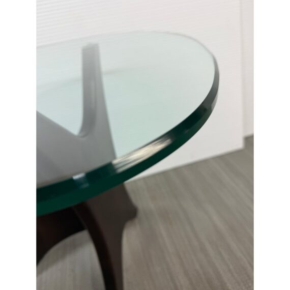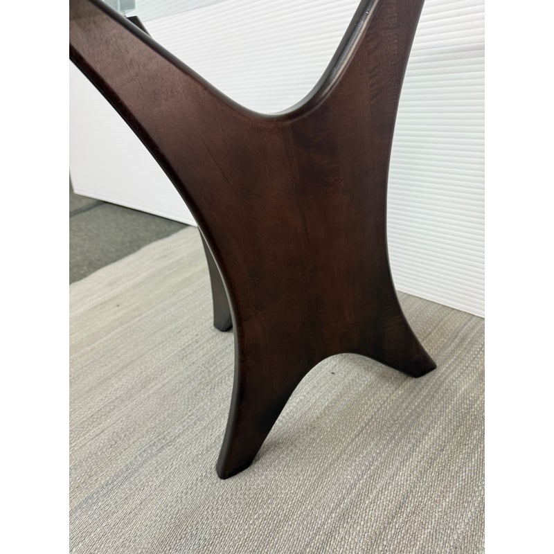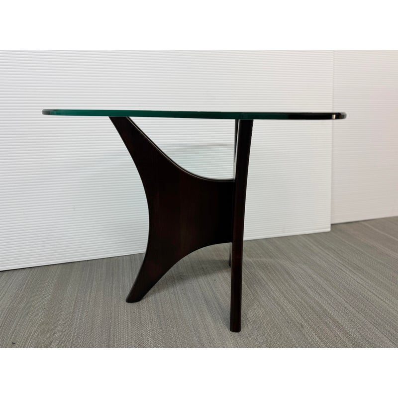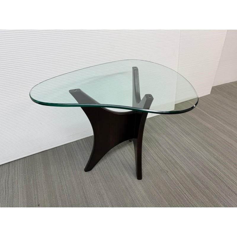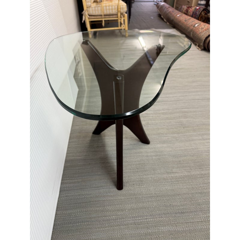 Design Plus Gallery presents an Adrian Pearsall Style Side Table. Amorphic expanse of thick glass tops the espresso “Jack” wood base. Scaled for use in many spaces around your home. Condition is good for age and use