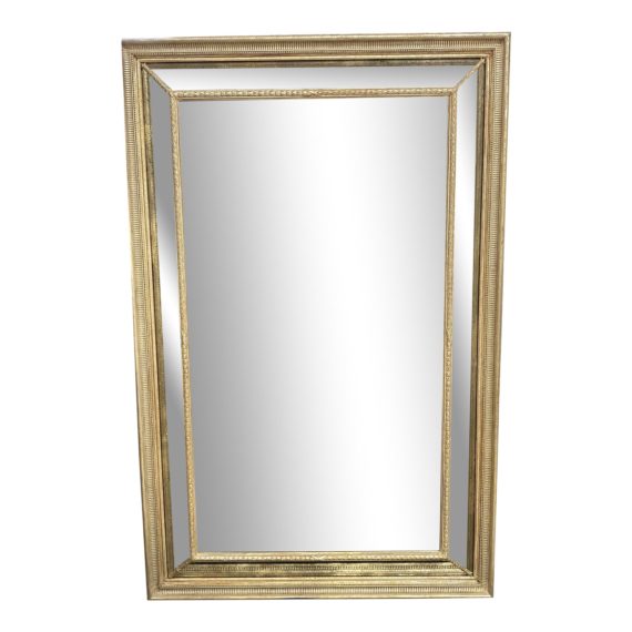 Design Plus Gallery presents a Aedicule Custom Antiqued Bronze Mirror. Louis XVI design modeled from Christie’s auction catalog. Outer frame; 2 ¾” wide moulding style frame with fluted scotia and running pearl bead at the sight. Beveled mirror panels (beveled forward) bordered by bow design modeled from original. Inner mirror portion; bordered by ¾” wide leaf imbrication. Surface treatment; 14K (white gold). Glazing: Inner mirror portion; Double-gilt (14K) DSB glass, light aging. Beveled mirror panels; Double-gilt (14K) DSB glass, aggressively aged.
