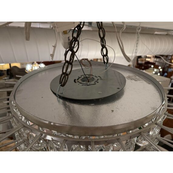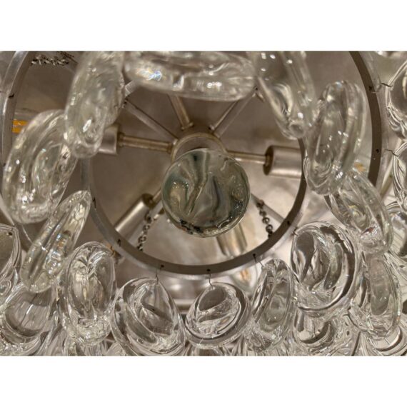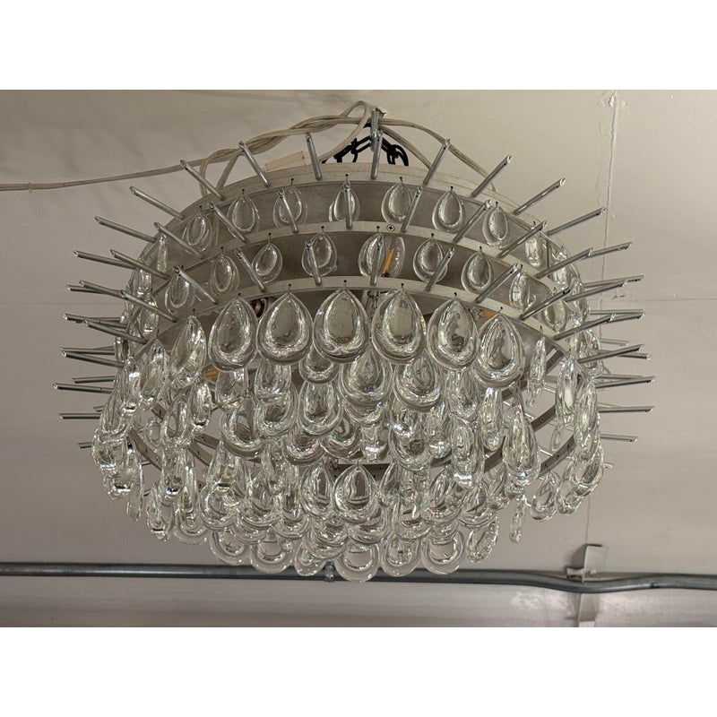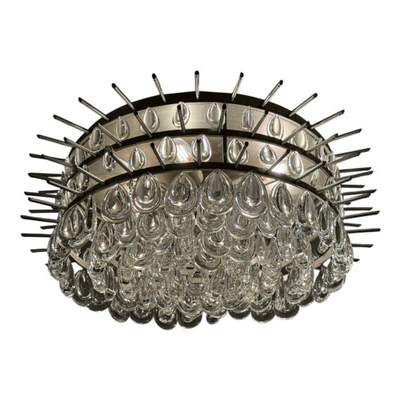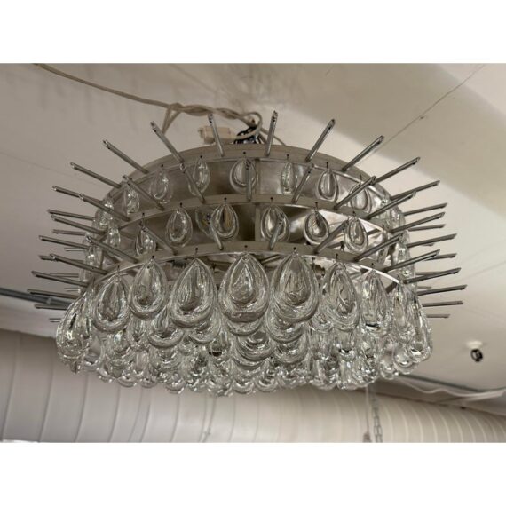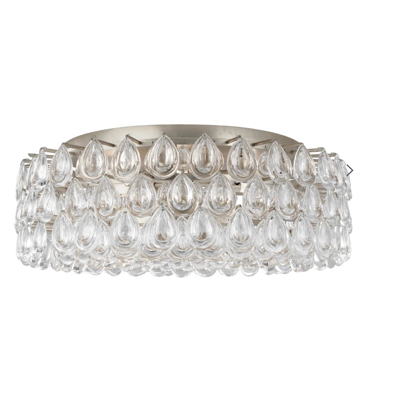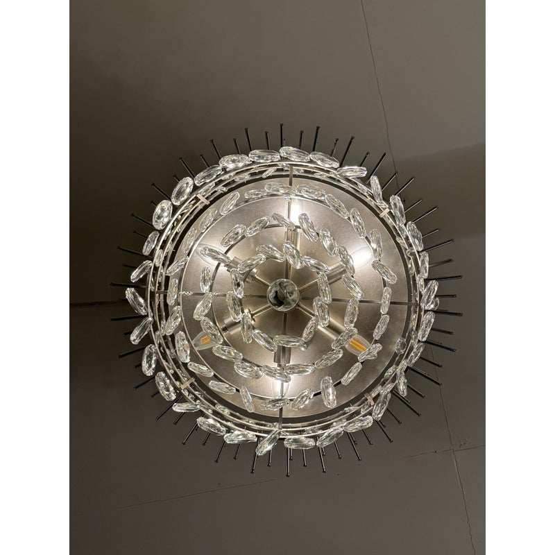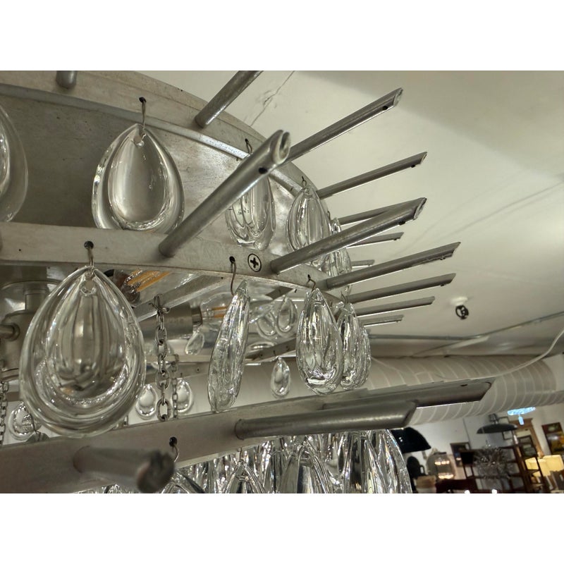 Design Plus Gallery presents the Liscia Flush-mount from AERIN. The Liscia is the perfect way to add some sparkle to a room, particularly larger spaces. Styled from teardrop crystals arranged around a tiered base, it is a beautiful addition to a living room, dining room, or anywhere you want to add an elegant touch. It is in good condition for its usage with not all the crystals attached in showroom and held separately.