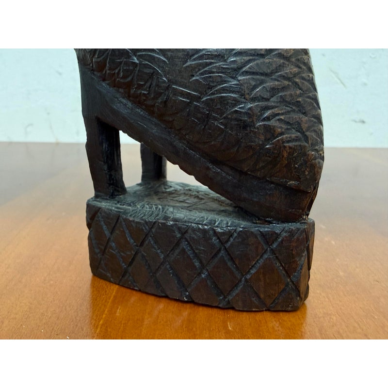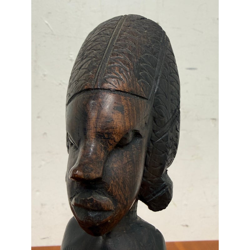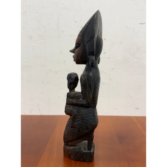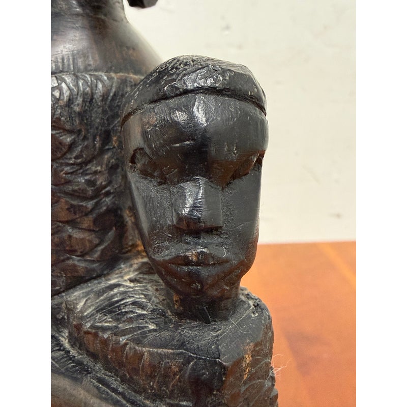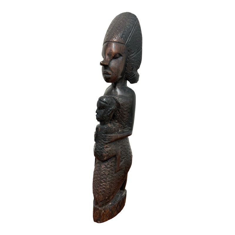 Design Plus Gallery presents an African Wood Carved Mother + Child Figure. This hand carved sculpture shows a standing female form holding a child, with elongated proportions and incised detailing throughout the surface. The figure’s stylized profile, textured patterning, and sculptural silhouette give the piece a distinct presence and sense of tradition. It is in good condition with visible and minimal wear from usage.