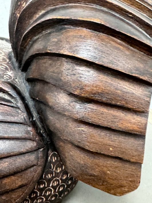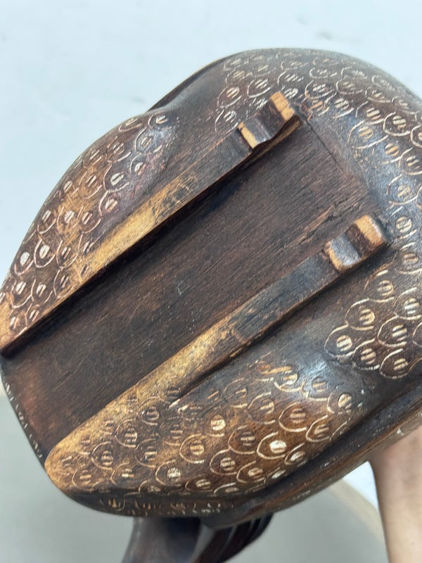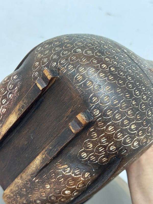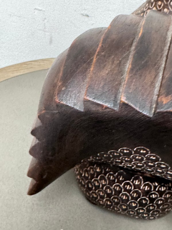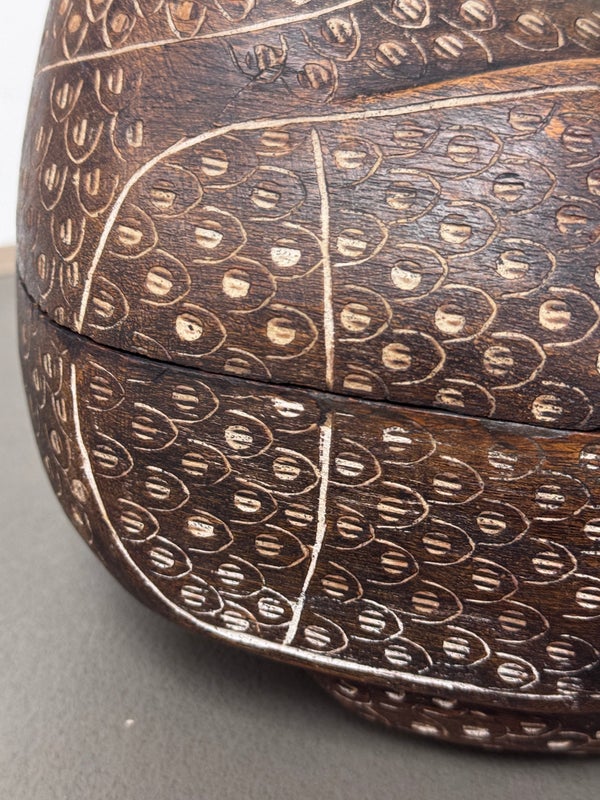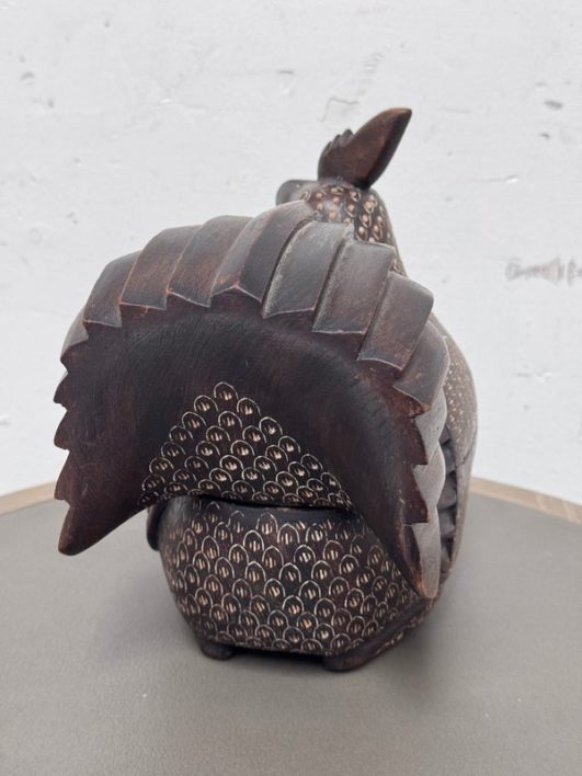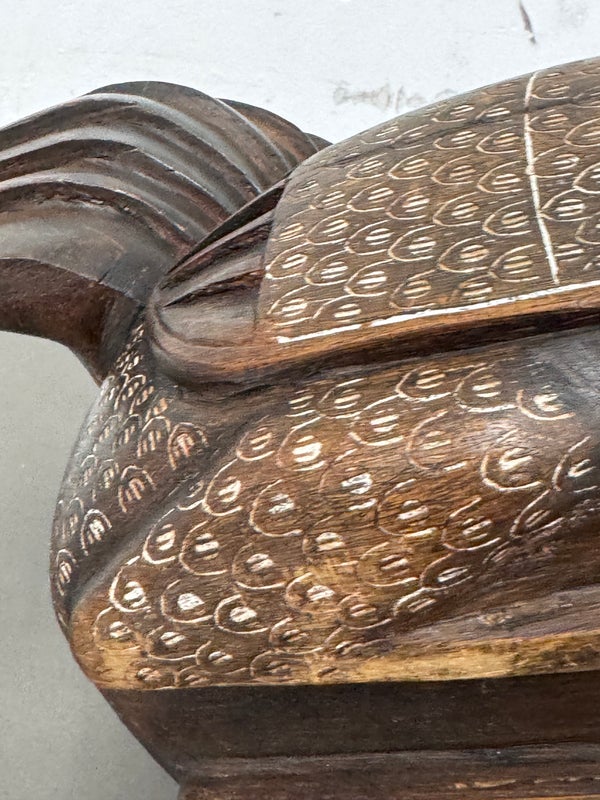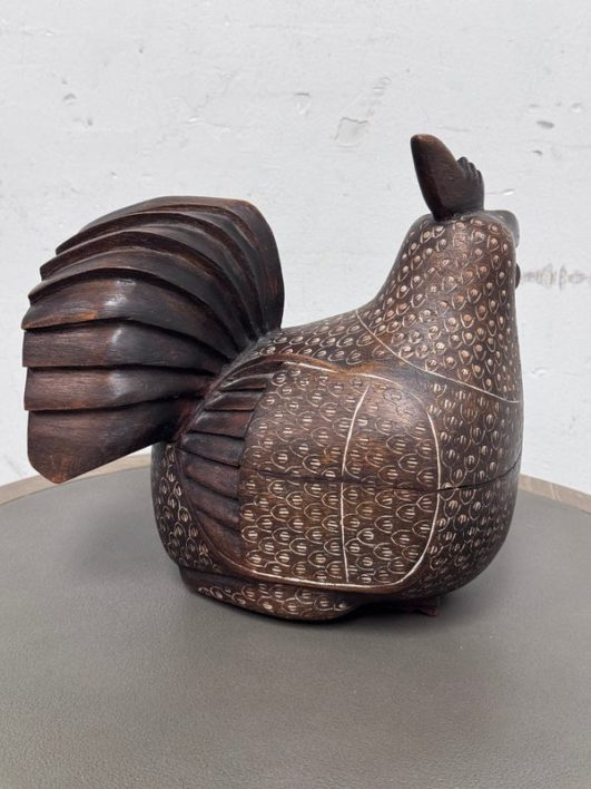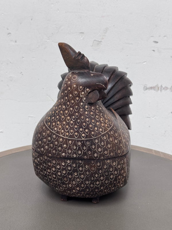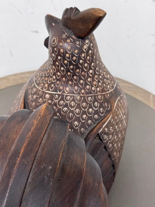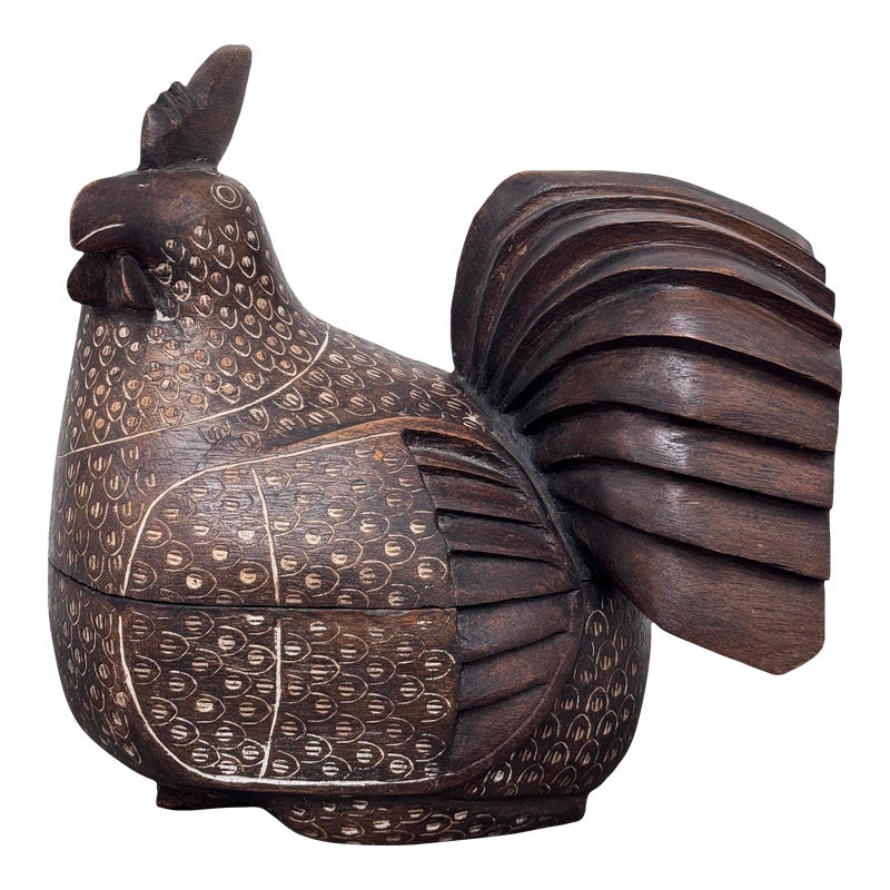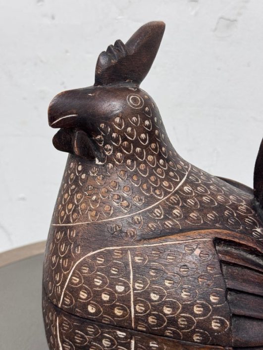Design Plus Gallery presents a Sculptural Box Made of Wood in the Form of a Hen. This piece has a dual form but the sculptural quality transcends making it an art form. The piece is carved from a single piece of wood. Incredible etching delineates thru the piece projecting beauty and form. Sculptural and organic. Is in good condition for its age + use.