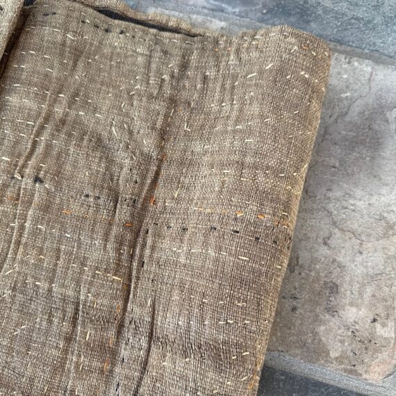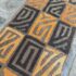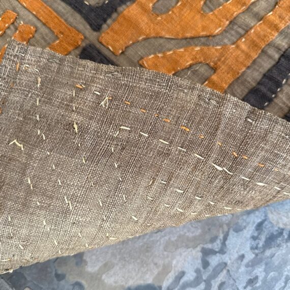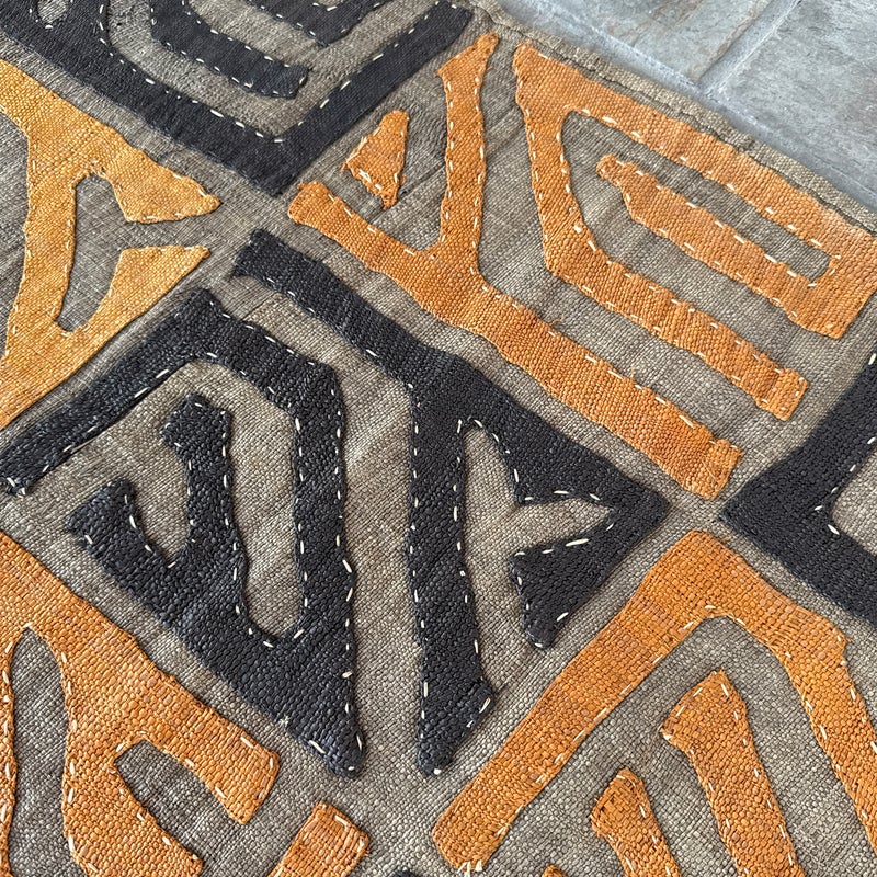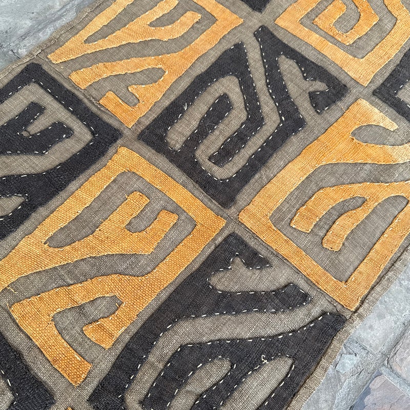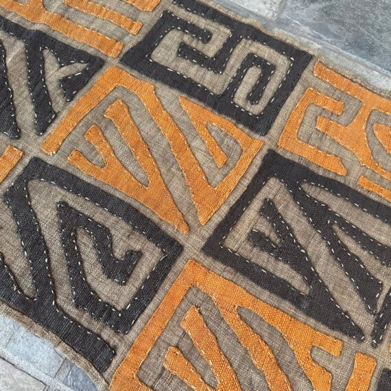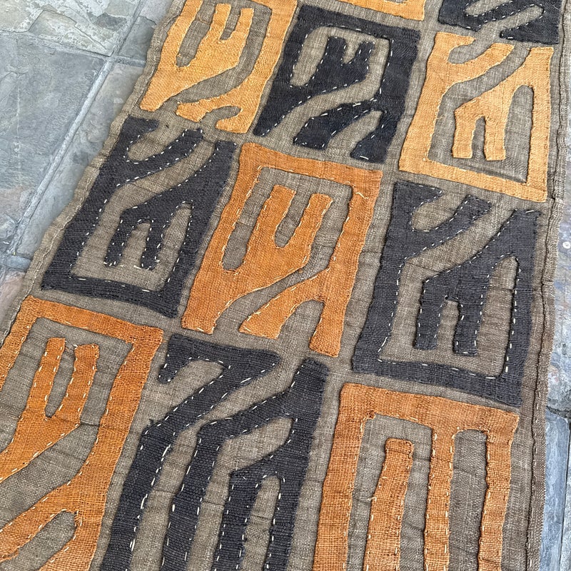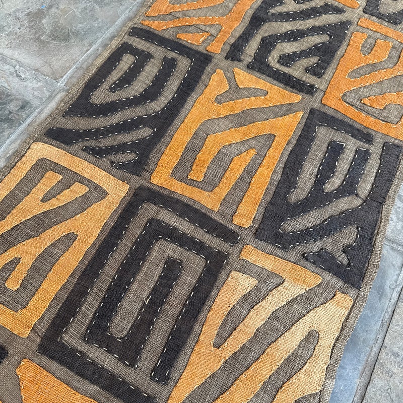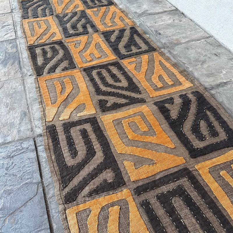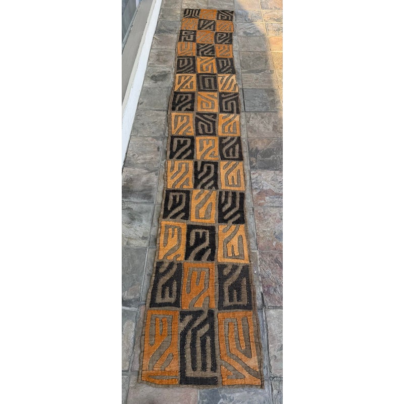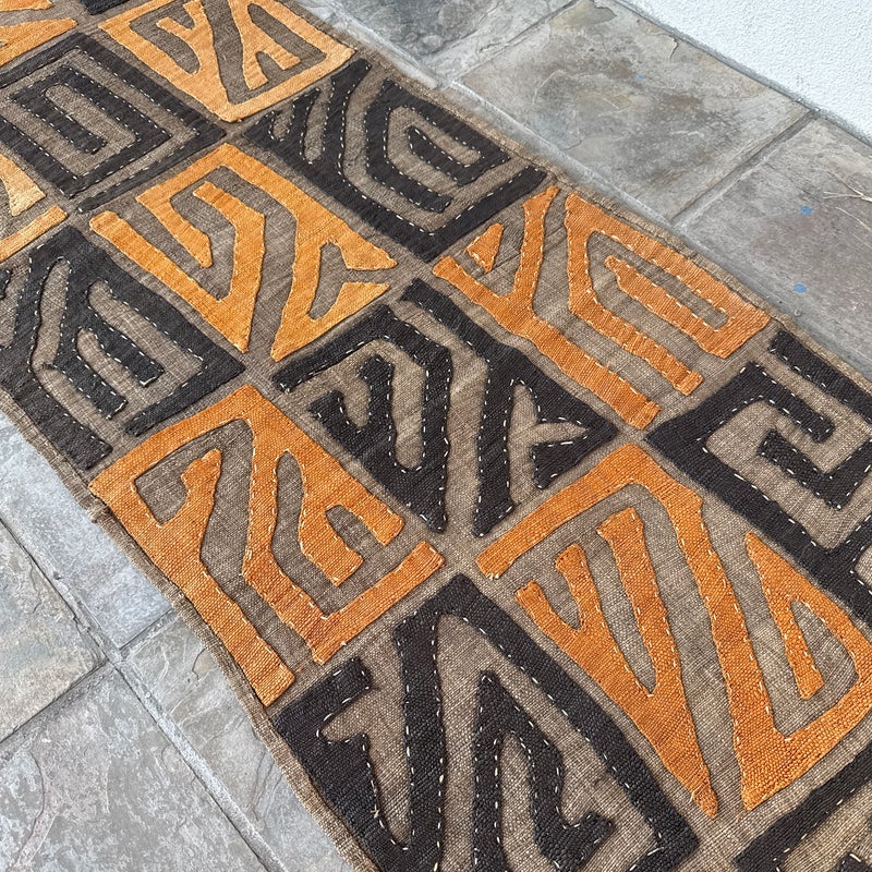 Design Plus Gallery presents an African Kuba Cloth Runner. The long natural base is a taupe linen that has been lightly adorned with stitching on one side, and hand appliquéd with orange and black symbols on the reverse. Little wear; good condition for age and use.
