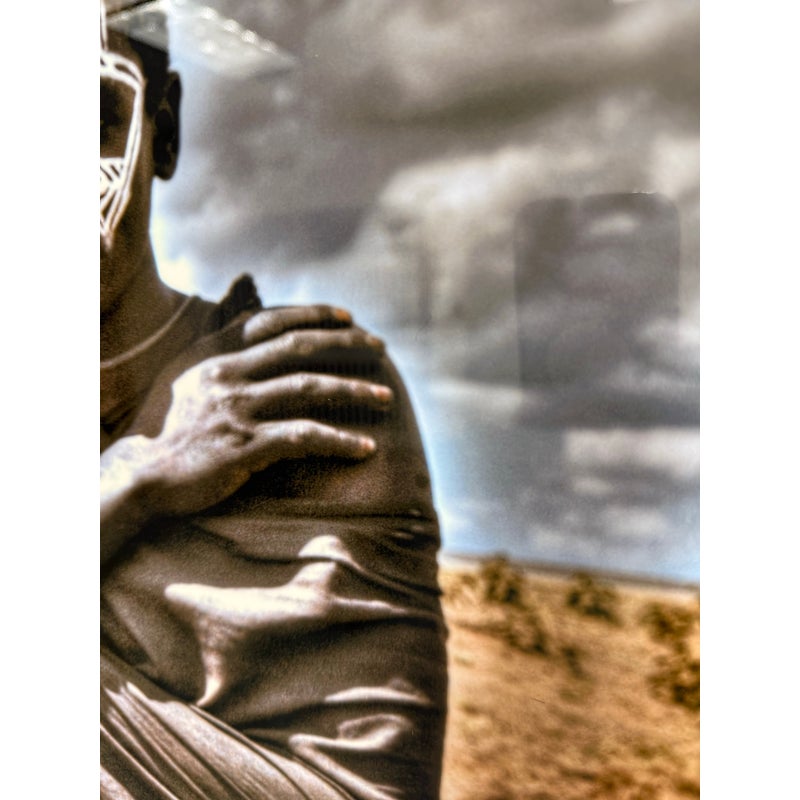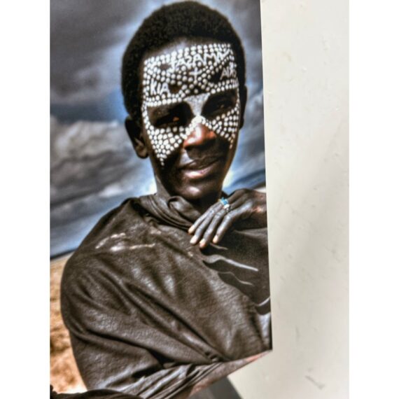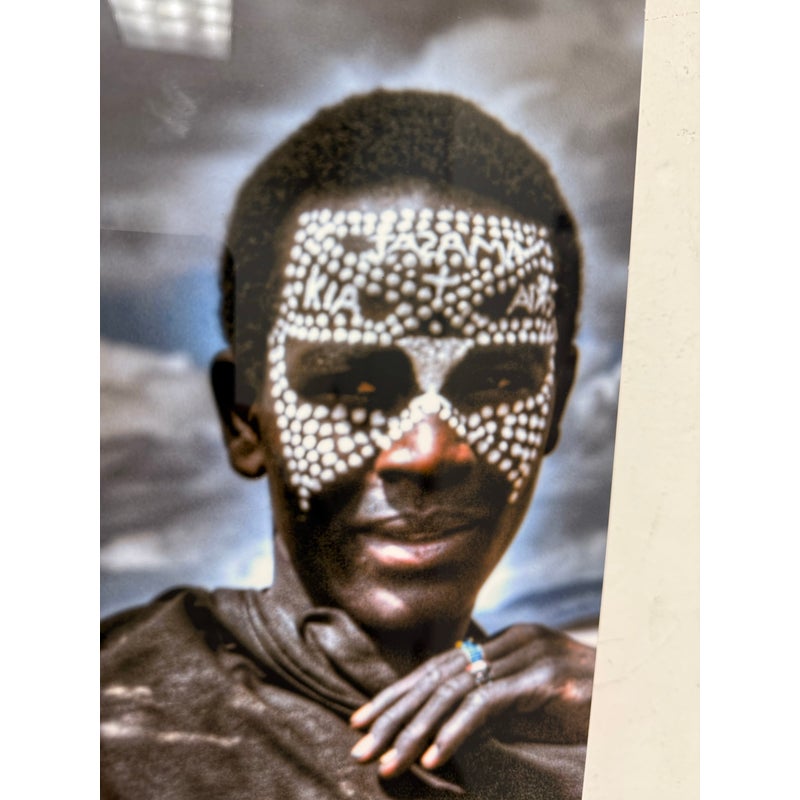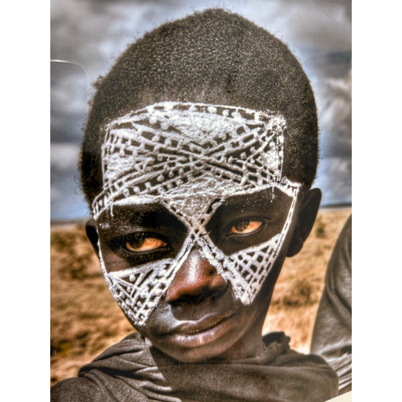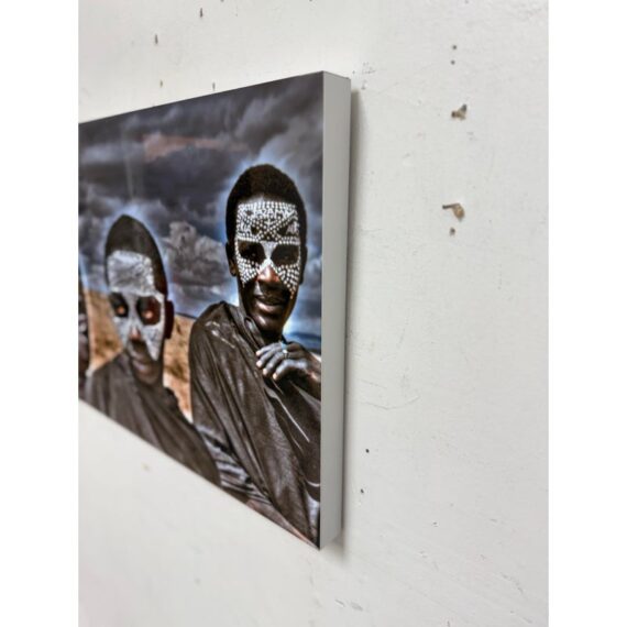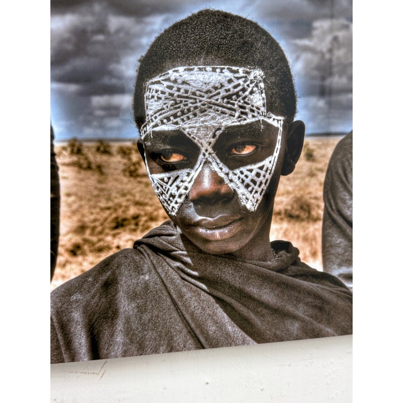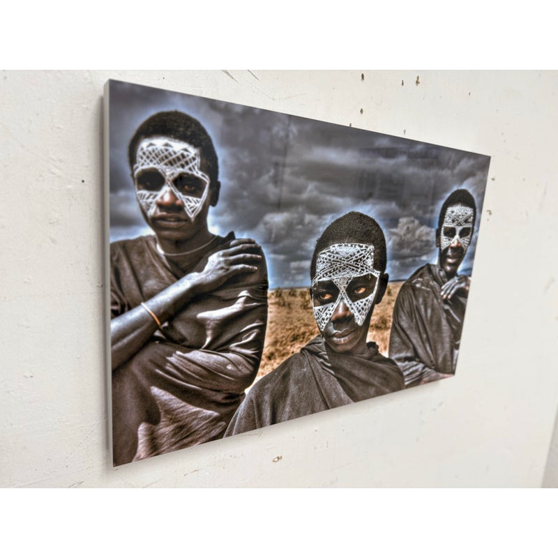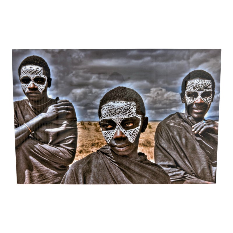 Design Plus Gallery presents a Photographic Print Displayed on Metal. The print is a striking portrait of three African men with their tribal face paint of white. They are standing against an expansive landscape with a dramatic sky. They have a calm possible resolute disposition with their gaze. The bold geometry of the paint create a powerful visual rhythm, while the sweep of earth and cloud adds a sense of scale and quiet grandeur. The art piece is in good condition, minimal wear.