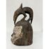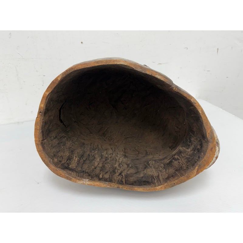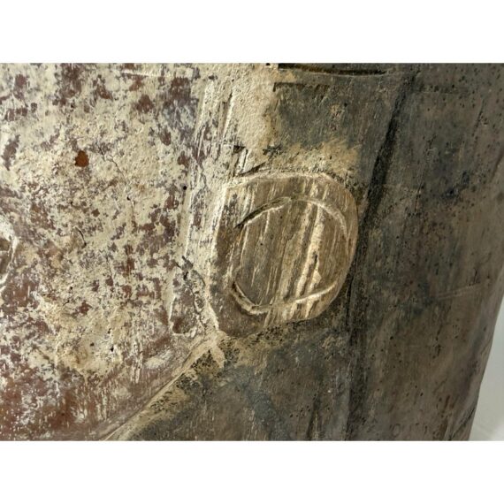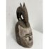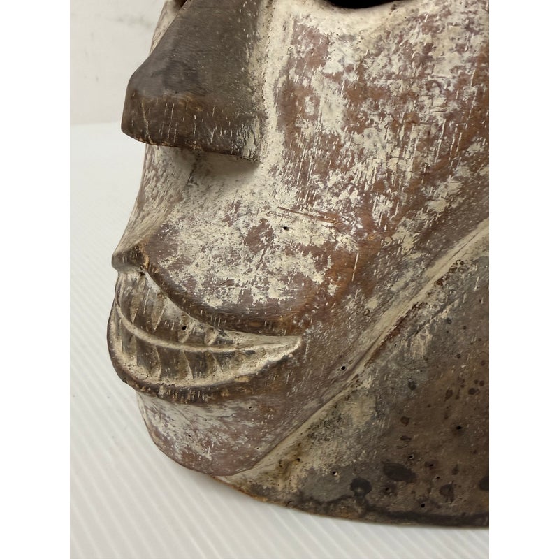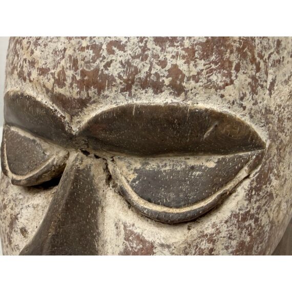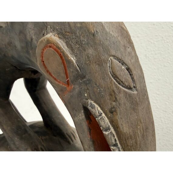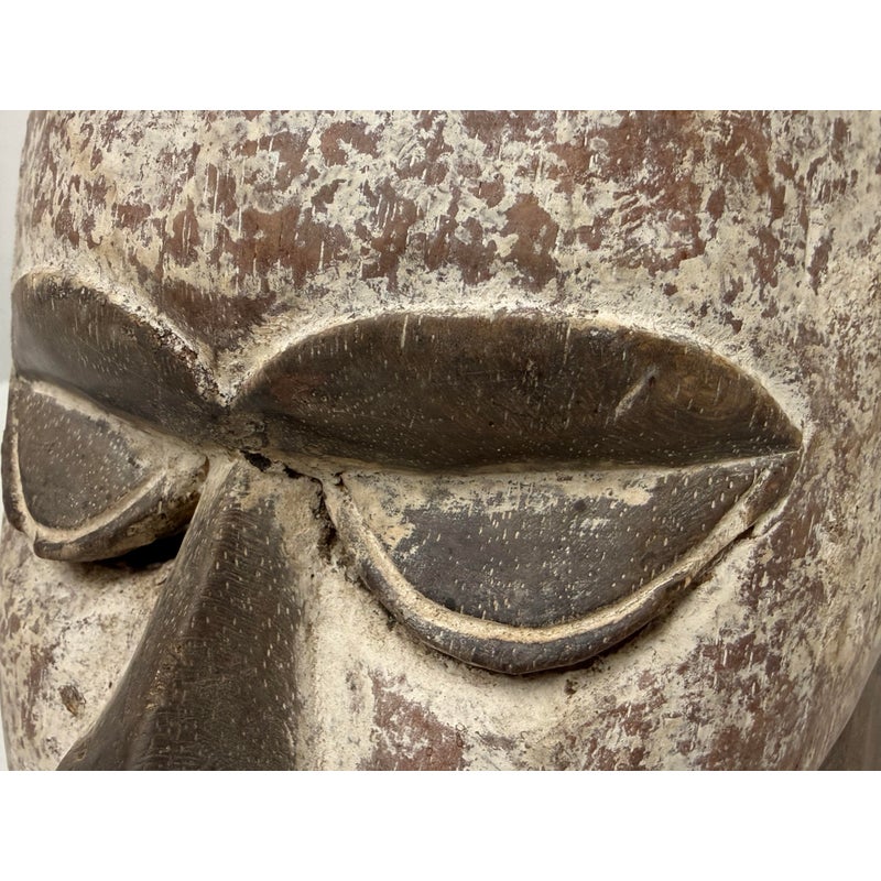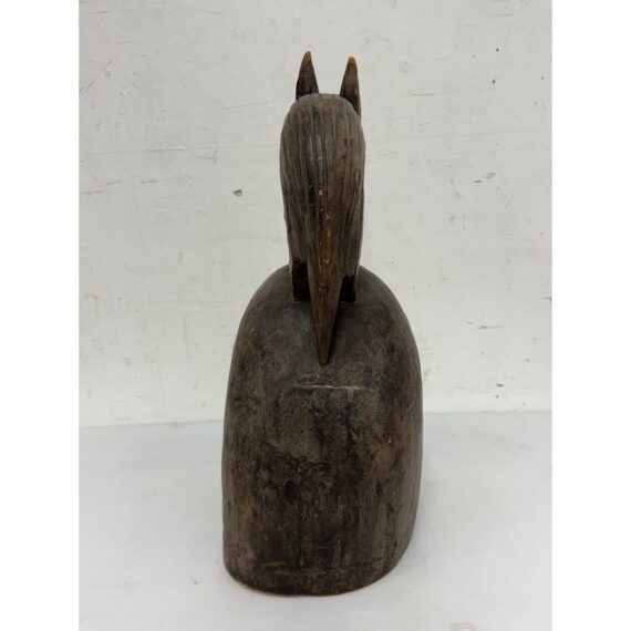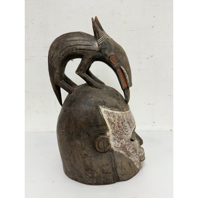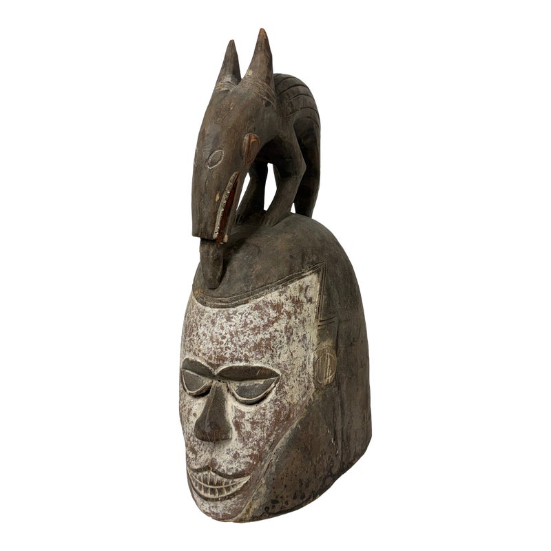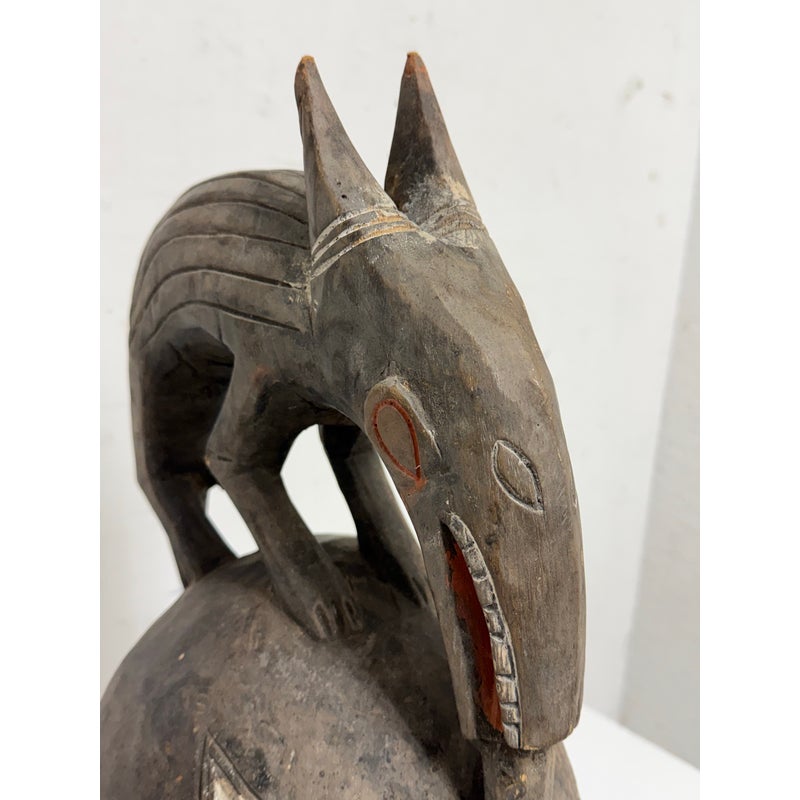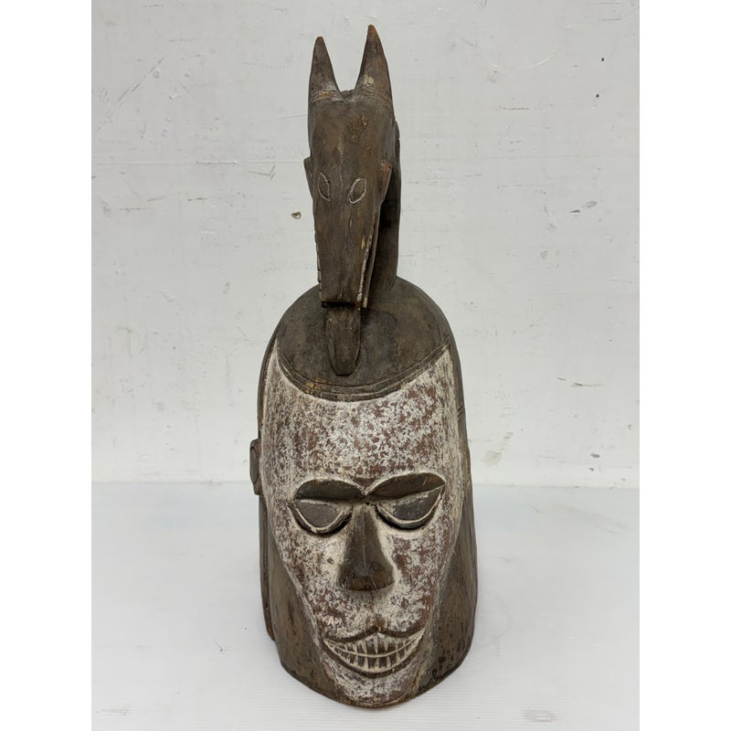 Design Plus Gallery presents an African Carved Wood Helmet Mask + Jackal Sculpture. This hand carved sculpture unites a long-faced mask form with a horned jackal standing above the crown in a commanding vertical composition. A textured whitewashed surface contrasts with the natural wood tone, while incised facial details, carved ears, and the arched animal silhouette emphasize its graphic character. Visible hand work- and age-related surface variation add depth and individuality to the piece. It is in good condition with visible and minimal wear from usage. Made in Nigeria.
