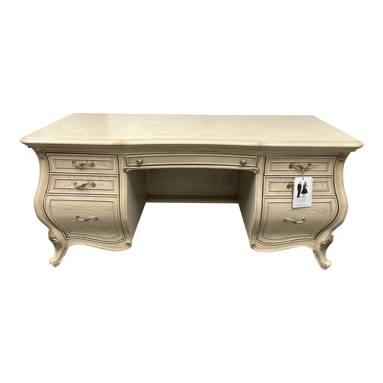 Design Plus Gallery presents a Michael Amini & Jane Seymour Platine de Royale Champagne Desk by Aico Furniture. French provincial is the heart and soul of the magnificent Platine de Royale Collection. It is rich and timeless, reminiscent perhaps of furniture handed down through the generations, yet stylishly interpreted for today’s homes. The finish is a Champagne over ash veneer and woods. is missing a few metal rods for the file drawer. Minor wear.