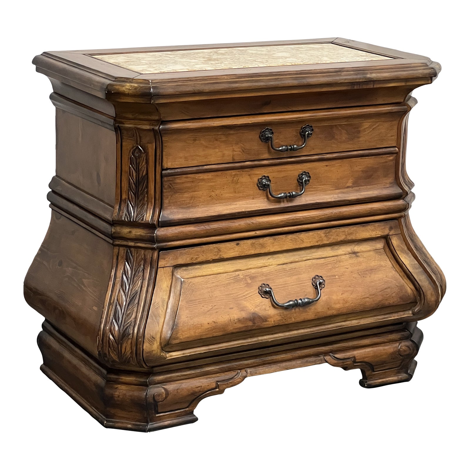 Design Plus Gallery presents a Tuscano Melagne Nightstand by Michael Amini for Aico. Tuscano Melagne bringing in the traditional of the Tuscany region of Italy. Features an Italian inlaid stone surface. The combination of carved leaf elements with clipped corner bombe styling gives this collection a truly unique look and feel. Visible wear on veneer chipping on corners. Minor wear from usage. This is a discontinued model.
