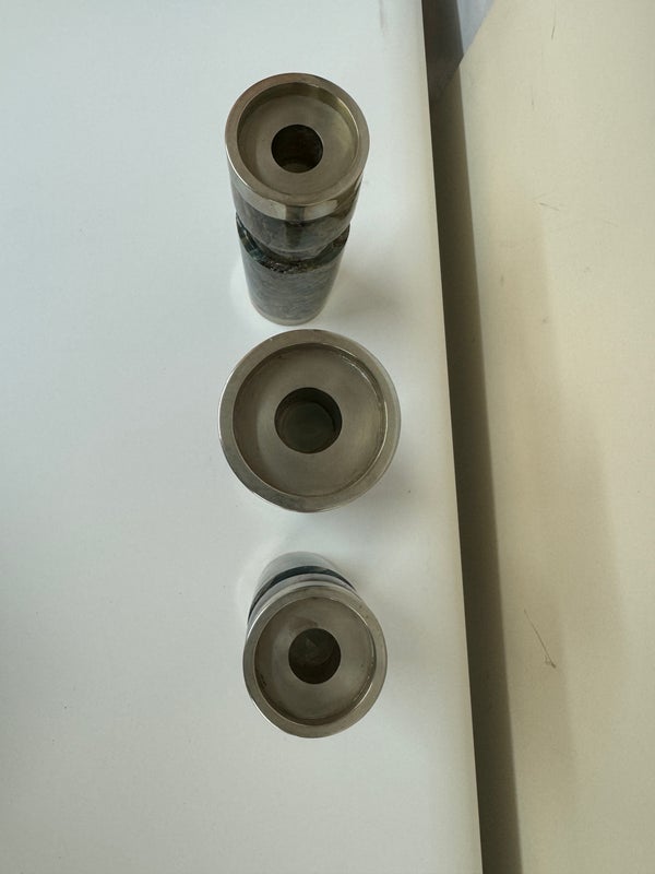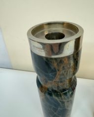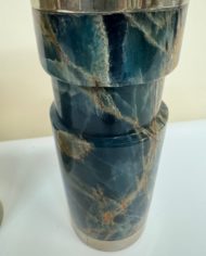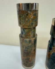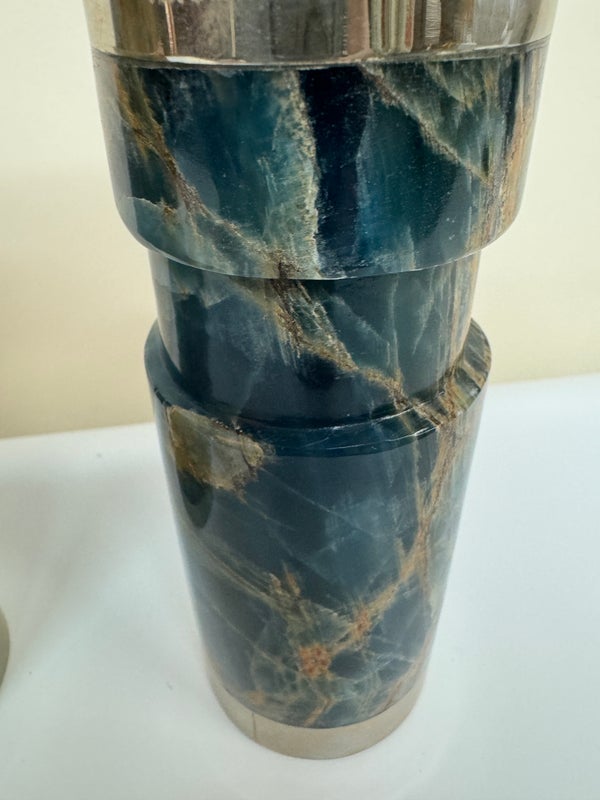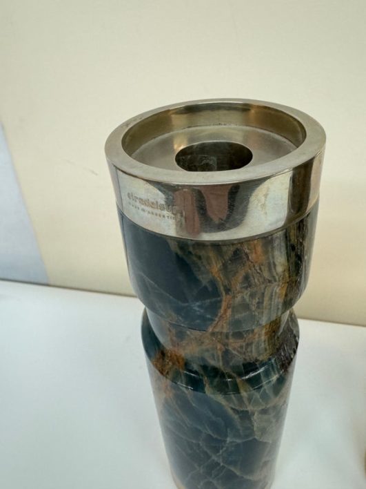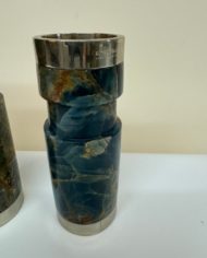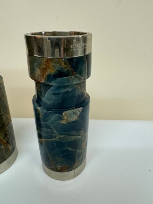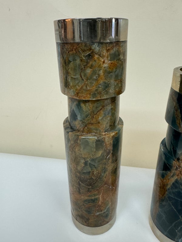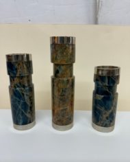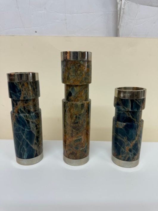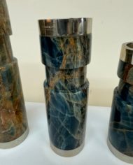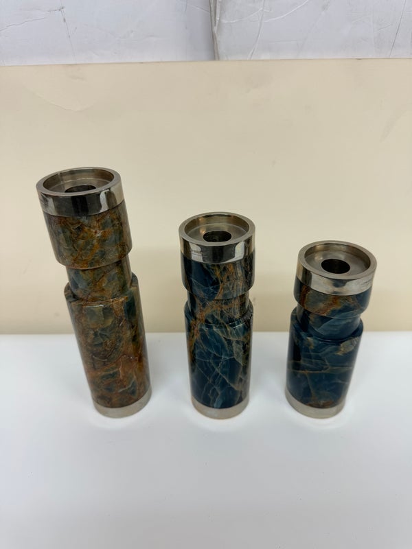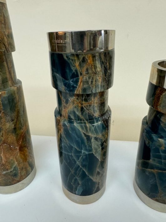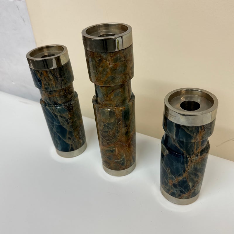 Design Plus Gallery presents a Trio of Vintage Candleholders by Airedelsur. Gorgeous veined blue onyx create the clean lined candleholders, fitted with Alpacasilver holders for a touch of glamour. Three sizes for staggering tapers. Little evidence of wear; condition is good for age and use. Made in Argentina.