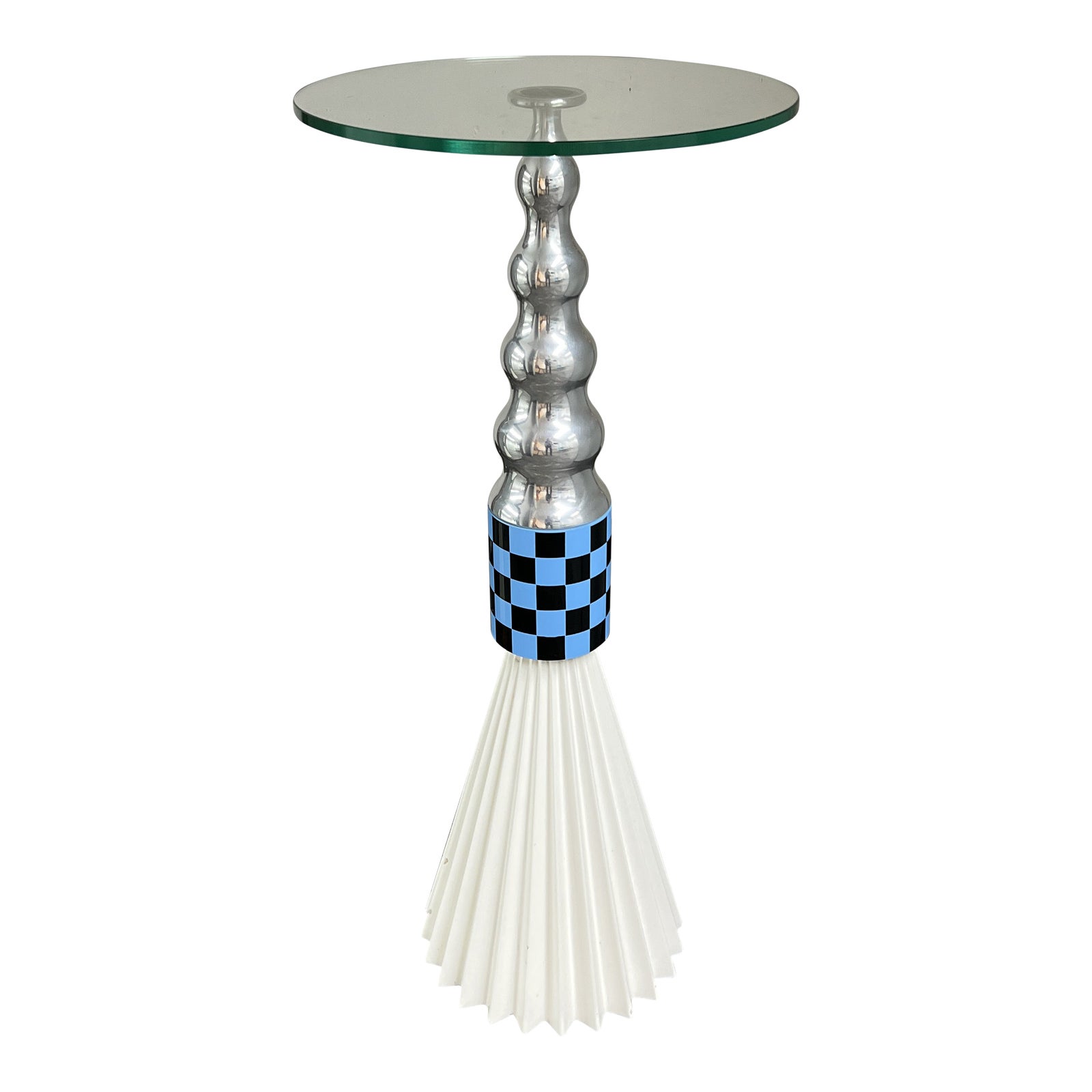 Design Plus Gallery presents the Alessandro Mendini Tavolino Viola Canina Bar Table. Features a harmonious blend of glass, aluminum, and enamel. A pedestal supports a round glass top. A checkered blue-black pattern connects the pedestal’s aluminum top and enamel bottom. Visible and minor wear from use; side table is in good condition.