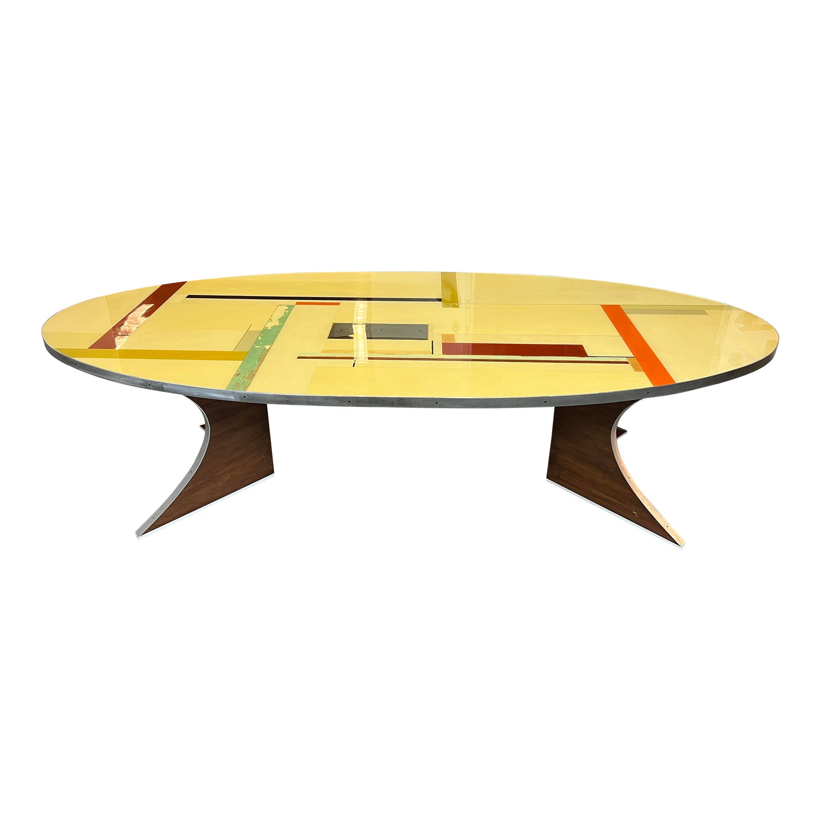 Design Plus Gallery presents an Alex Garcia Custom Modern Oval Table. A one of a kind conference table custom designed by artist Alex Garcia. This large table can be a fun dining table or a large conference table for your work space. The frame is steel with a top surface that is inlayed with multiple veneers and textures. The table does not come with hardware for attaching but can be easily with universal screws. Visible and minor wear from usage. A small clear section on the surface top where a small metal tray was once was. Does not effect table usage. Table is in good condition.