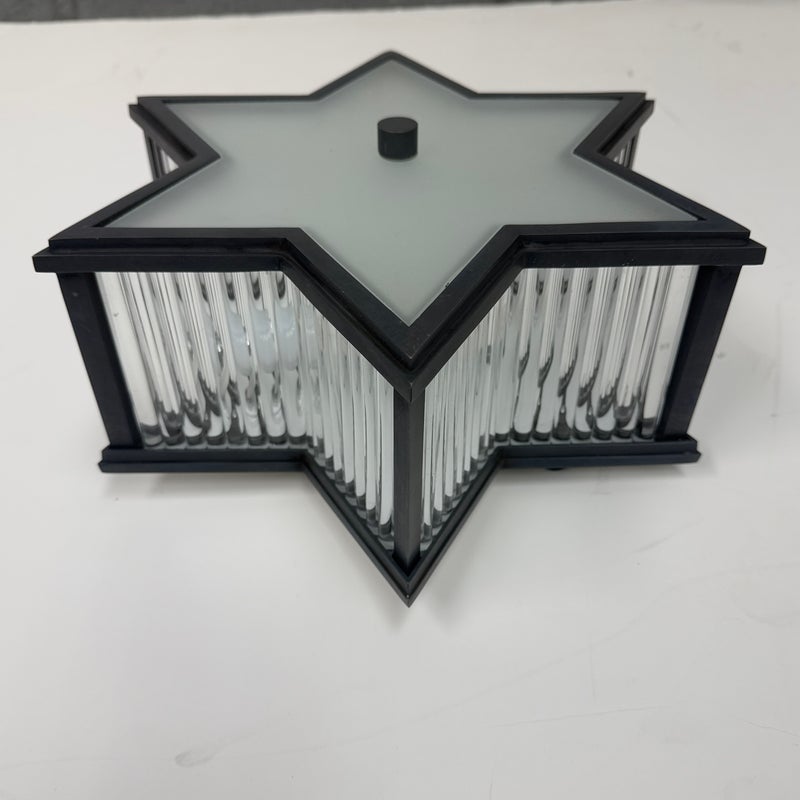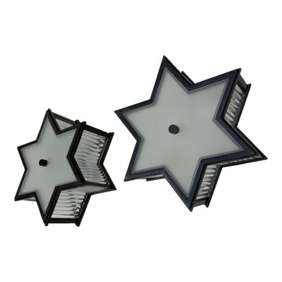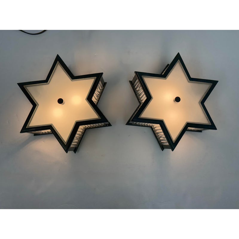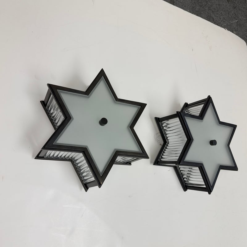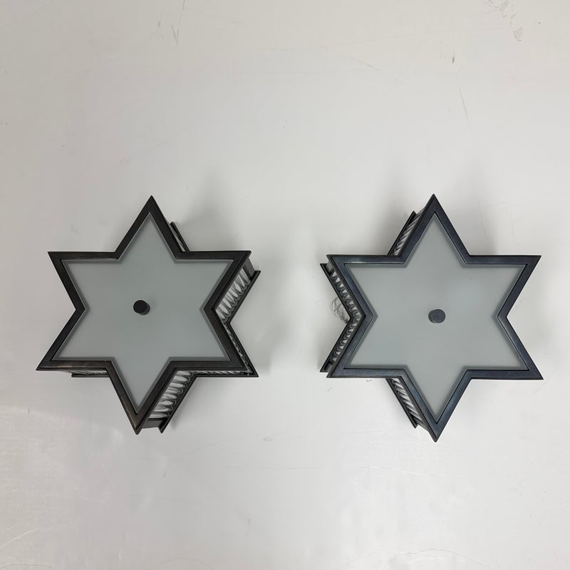 Design Plus Gallery presents a Pair of Sophia Flushmounts by Visual Comfort Signature. Designed by Alexa Hampton. This light will evoke the celestial with its star-shaped shade crafted of detailed metalwork with timeless finish. This frame, along with a Frosted Glass diffuser ensure that this fixture will light up the sky in your home with warmth and style. In good condition with minimal wear from usage.