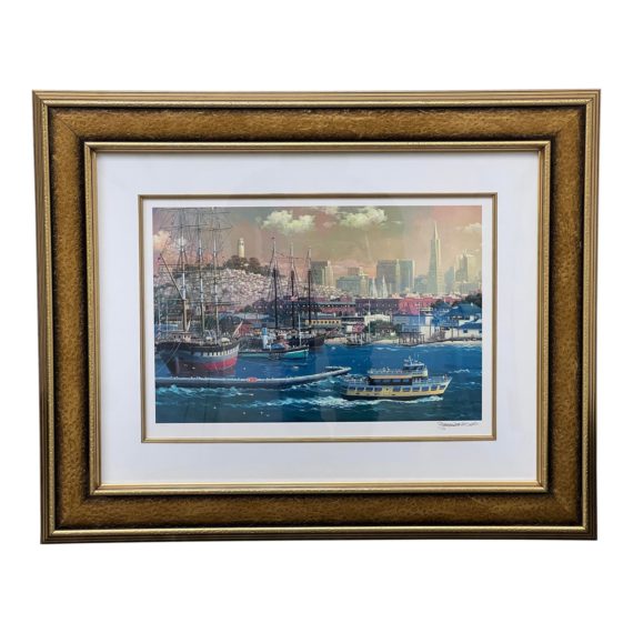 Design Plus Gallery presents a Painting of ‘Old Blue and San Francisco Maritime Park’ by Alexander Chen. A fine example of life on the Pacific Coast just flanking the Golden Gate Bridge near the Maritime Park. Stunning use of colors with a beautiful sky glow emitting a lovely sunset with the spectacular skyline in that horizon. The boats are the focal point, sailboats of varying colors, sizes, and age. The picture is valuable and the frame is incredible, double mating and widened bronzen frame. In good condition with minor wear.