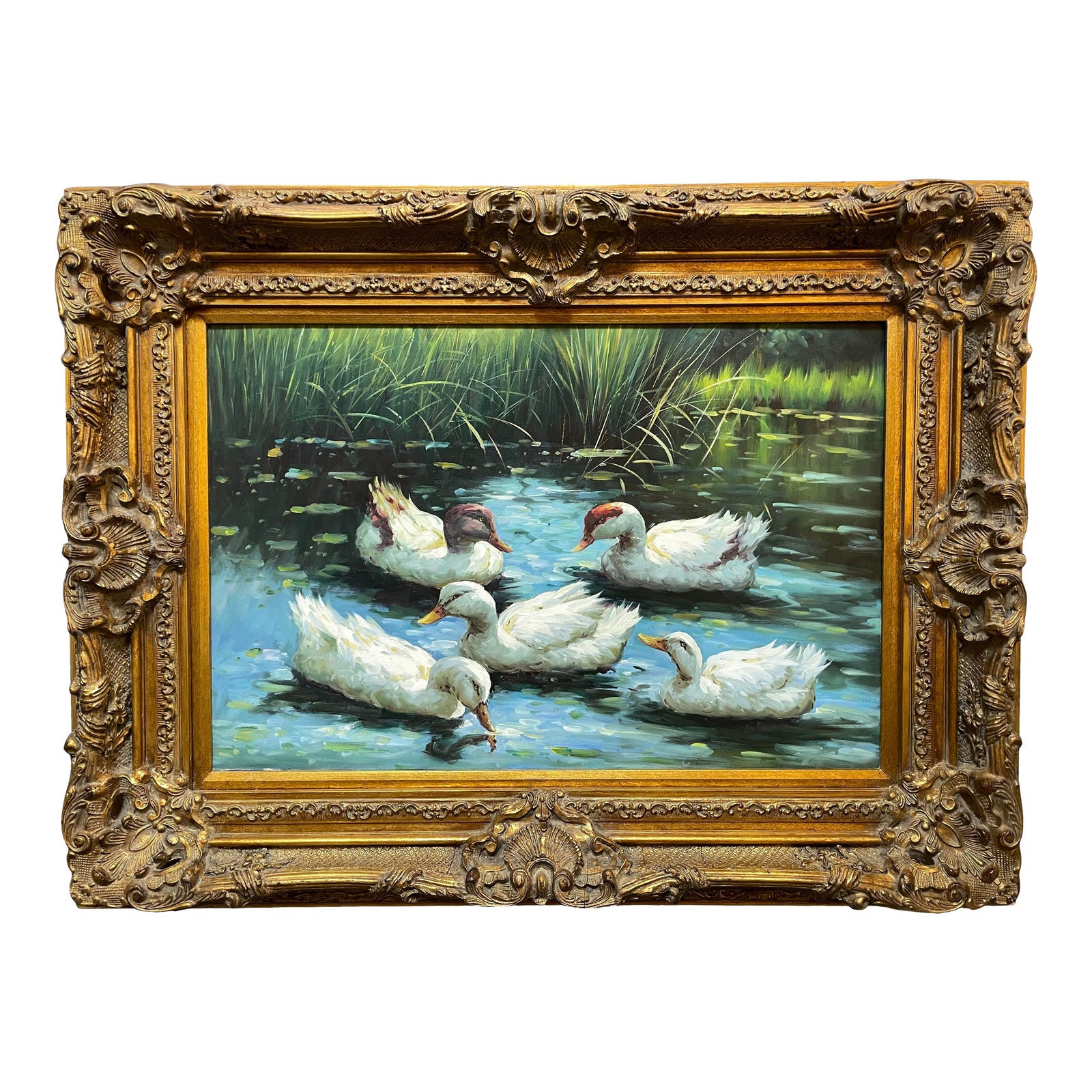 Design Plus Gallery presents an Original Painting “Pond”. This serene tableau of waterfowl on water, feels like classic Alexander Koester Paintings. Strikingly framed in a large, deep Vintage frame with a gilt finish, the giggle reproduction painting easily becomes a focal point in any setting. Unsigned.