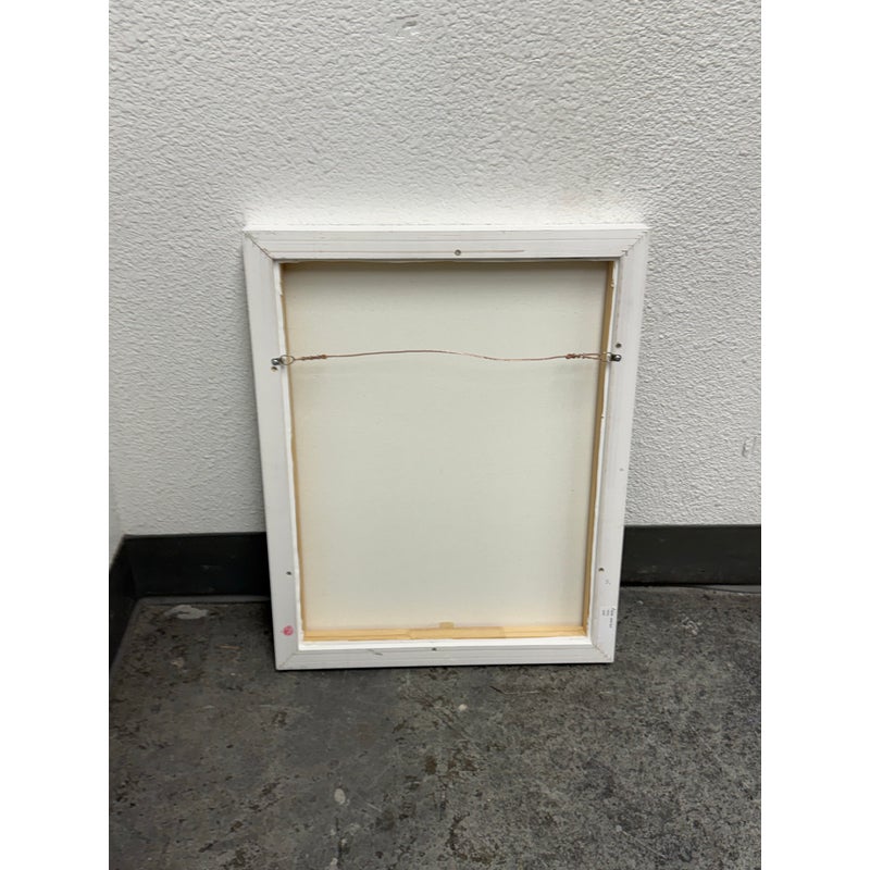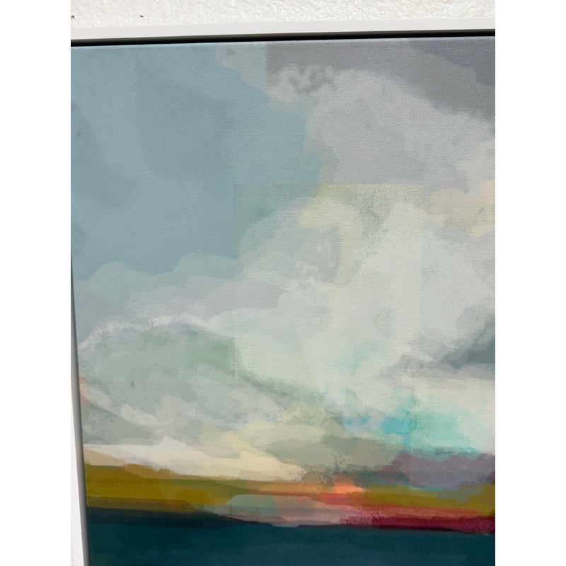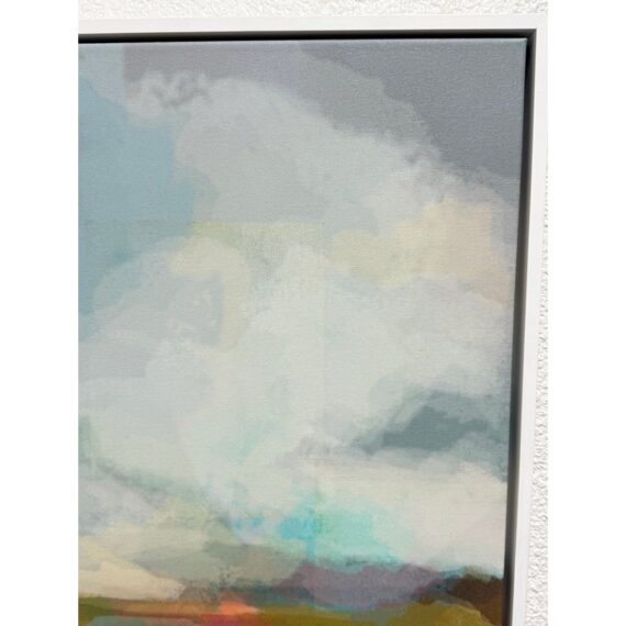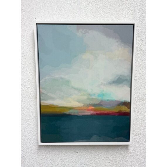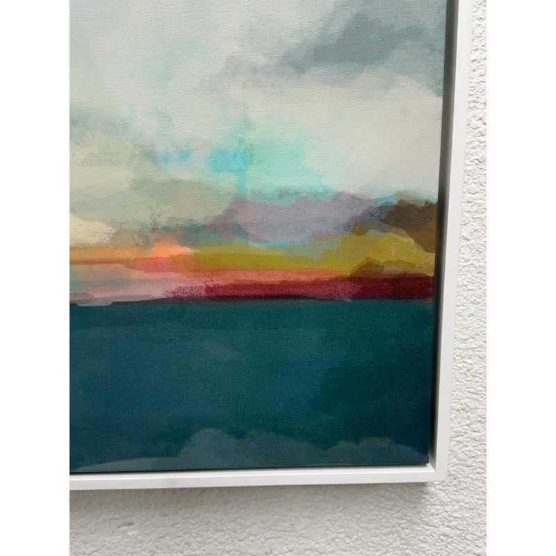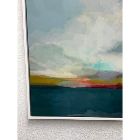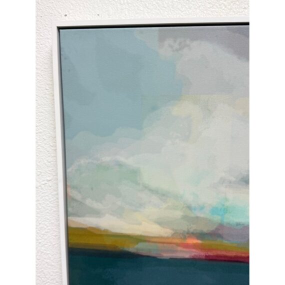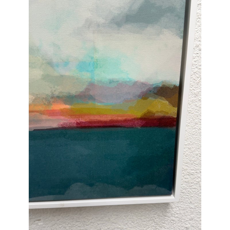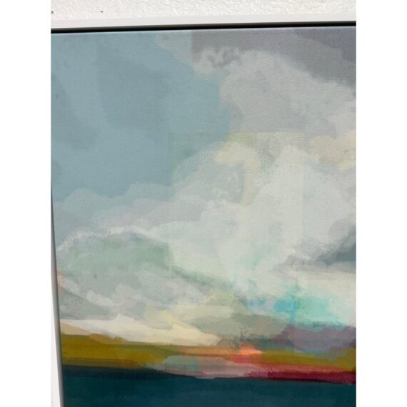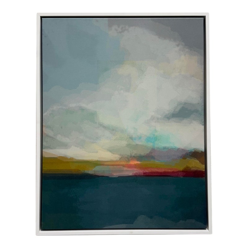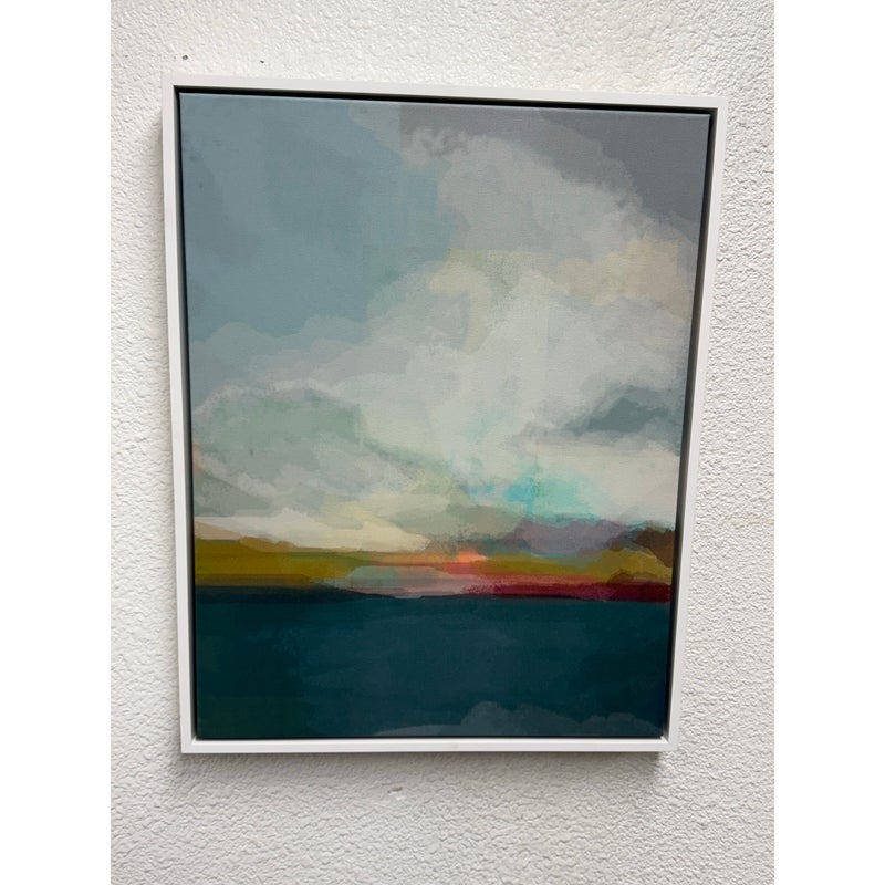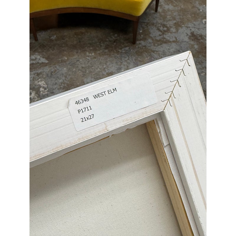 Design Plus Gallery presents “Morning Walk, II” by Allison Jerry for West Elm. This art work was inspired by the artists memories brought onto by traveling across the US where she observed land with the sea in the background. The abstract has an overcast presence possibly capturing the last light of day near a wide body of water. The print is encased in a white frame and is protected by plexiglass. It is in good condition with minor visible wear for its usage.