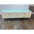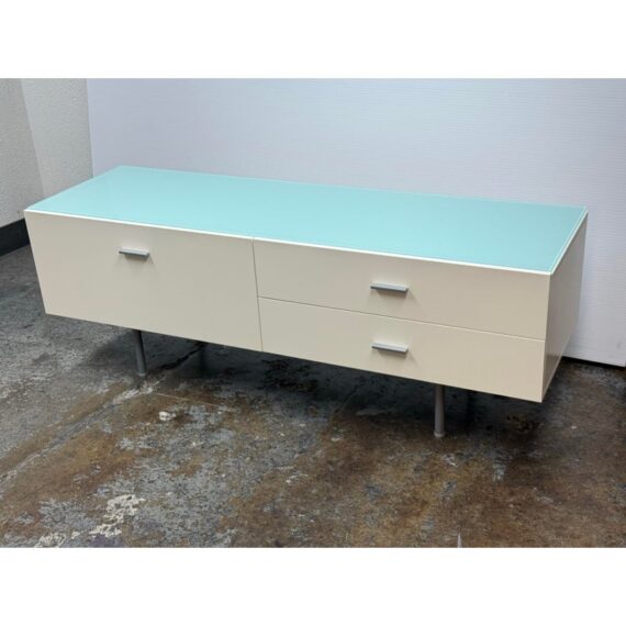 Design Plus Gallery presents an Italian White Lacquer + Tempered Glass Sideboard from Alivar. The storage piece has a double drawer configuration, while the left offers a deep single drawer for versatile storage. The white lacquered cabinet is elevated on four aluminum-finished legs, complemented by matching rectangular hardware for a cohesive, minimalist presence. A tempered glass top sits neatly on the surface, adding a refined contrast to the crisp white finish. This is a discontinued model with the brand. In good condition, visible and minimal wear from usage. Made in Italy.