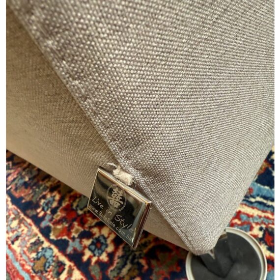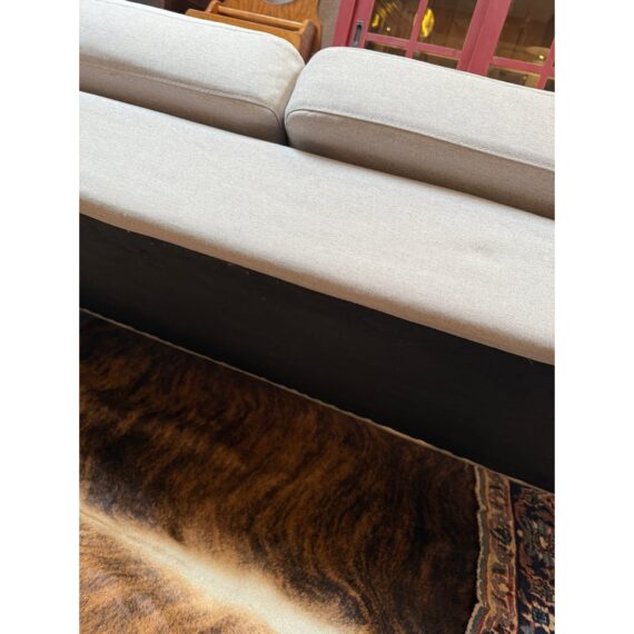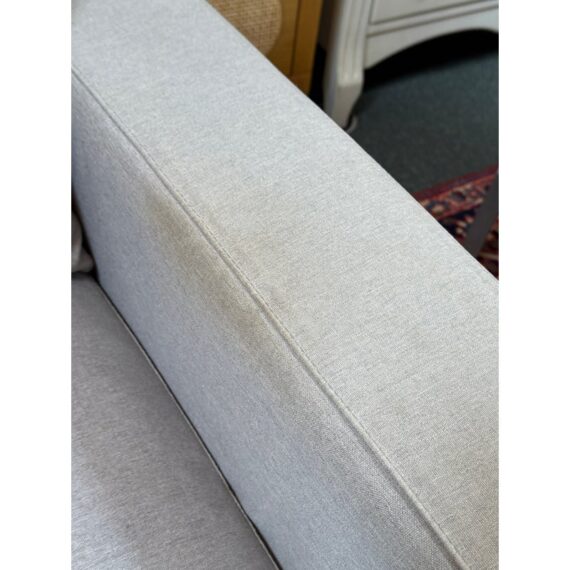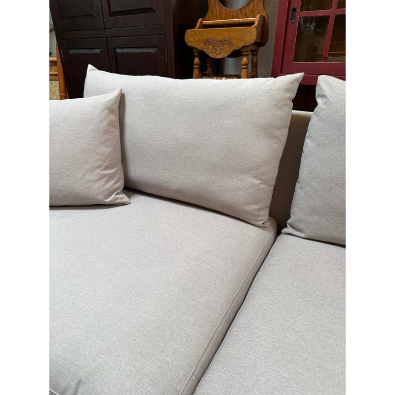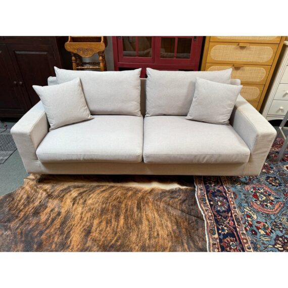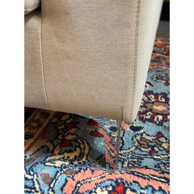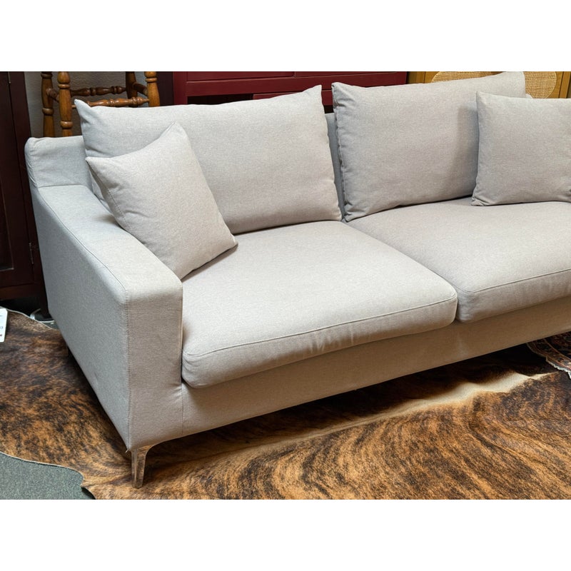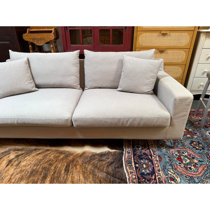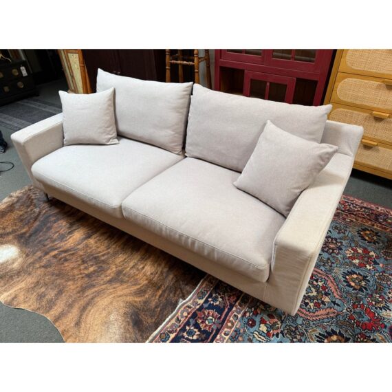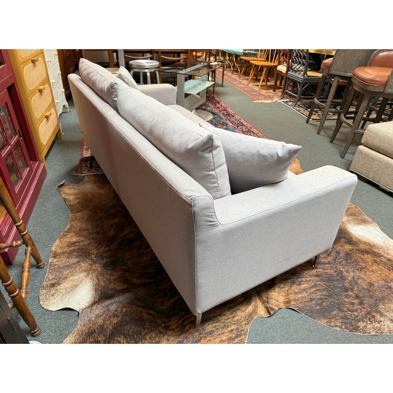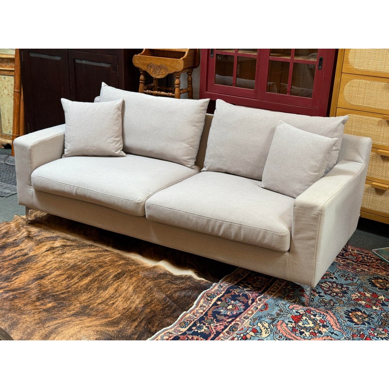 Design Plus Gallery presents a Contemporary Jones Apartment Sofa from All Modern. The sofa offers a crisp silhouette that keeps the design current with deeply cushioned back + comfortable seat cushions. The entirety of the frame is wrapped in neutral linen-like upholstery and elevated on polished steel legs. A pair of matching throw pillows are included. Visible soil and spill under cushion; condition is fair for age and use.