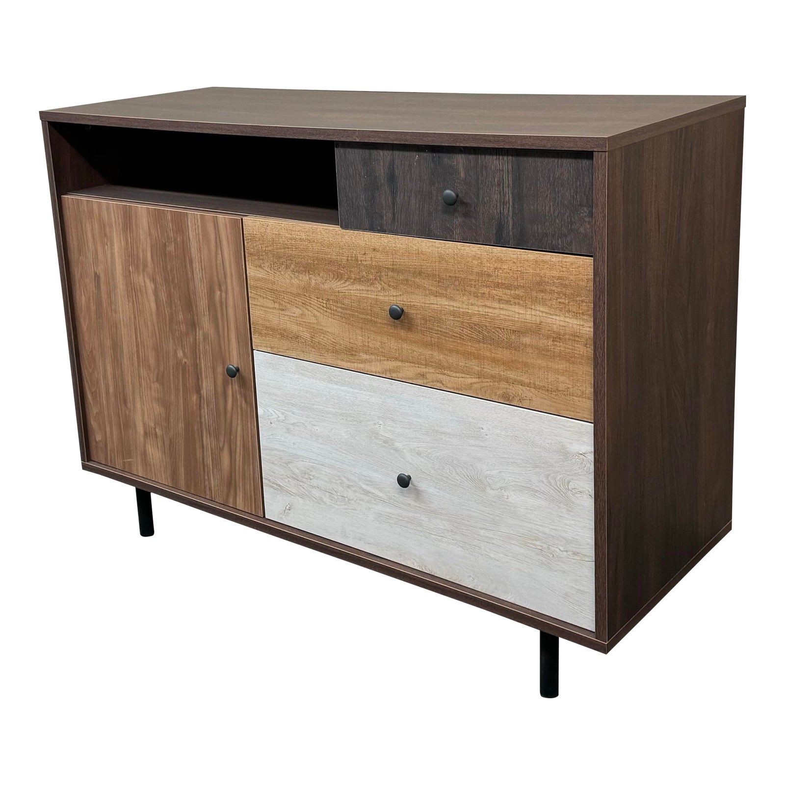 Design Plus Gallery presents an Eden Rue Credenza by All Modern. The credenza is a versatile and stylish piece of furniture that combines functionality with modern design. It is perfect for holding a television and other entertainment essentials, while also providing ample storage space for various items. The cubbyhole storage allows for easy organization, while the adjustable shelving behind the door offers customizable options for storing different sized items. The metal legs provide a sleek and contemporary look, while the three drawers glide effortlessly on metal runners for smooth operation. In good condition, visible and minor wear from usage + age.