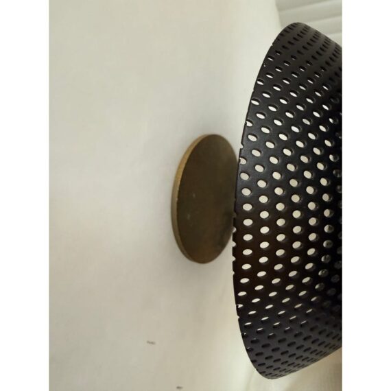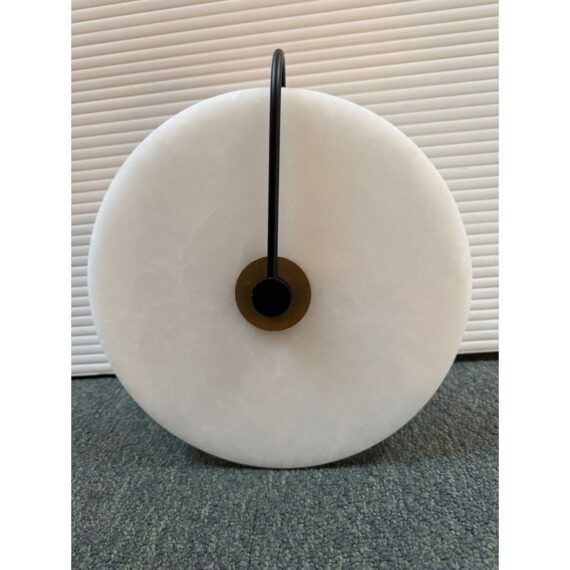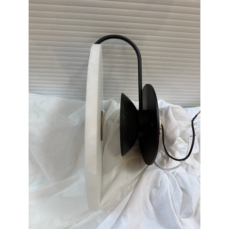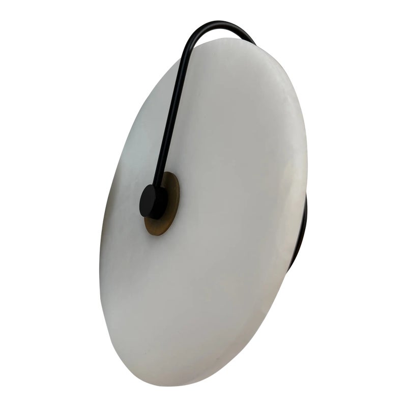 Design Plus Gallery presents an Aperture Wall Sconce from Allied Maker. The Aperture series was created to provide a beautiful quality of light by combining bounce and ambient glow. The light source is held in a hand-spun perforated brass dome on one side, while a hand-bent tube arcs around the other; diffusing and bouncing light within a hand-bent alabaster shade. A magnificent piece of art for your wall. It is in good showroom like condition.