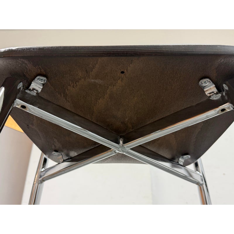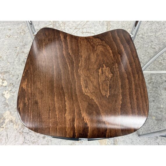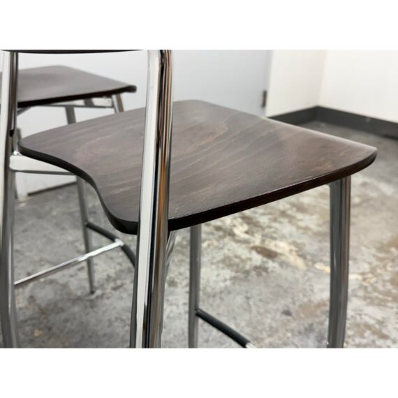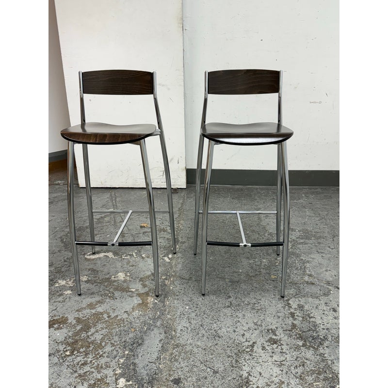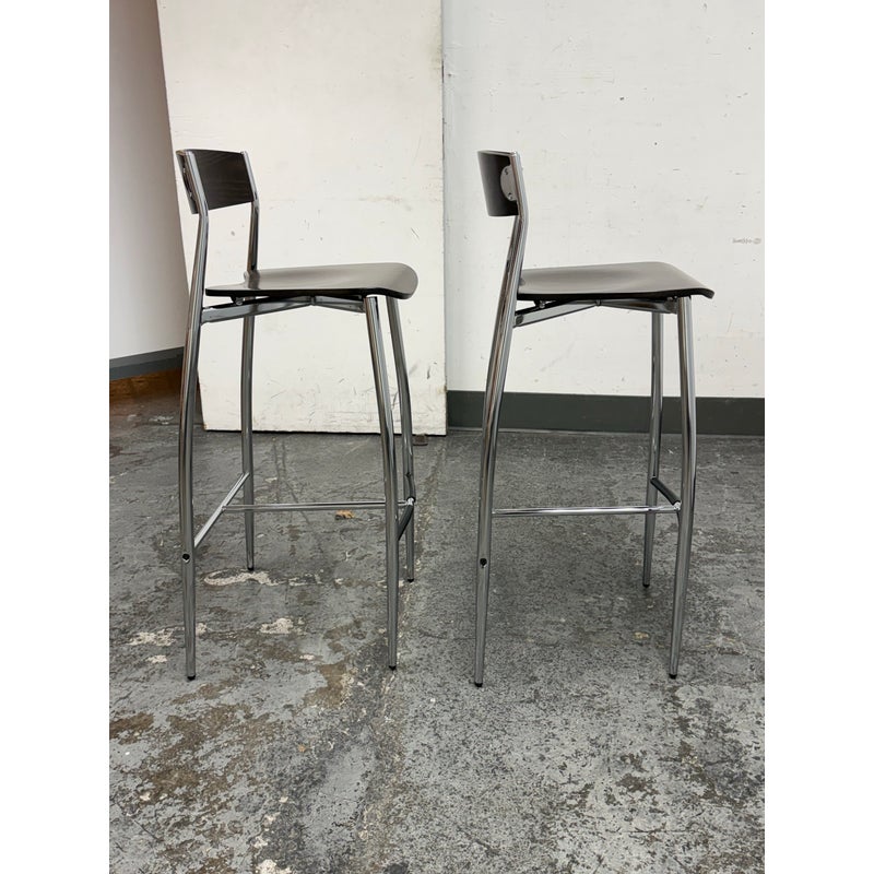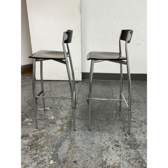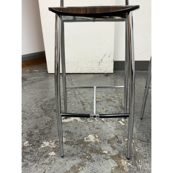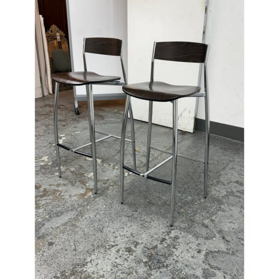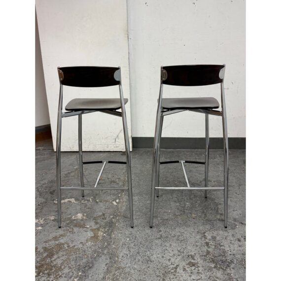 Design Plus Gallery presents a Pair of Baba Bar Stool from Altek Italia Design. Transforming an ordinary furniture piece into an extraordinary design that is as comfortable as it is elegant, these stools from Mian’s Baba Collection add class to a modern cocktail lounge table, kitchen island, or bar counter. The sleek and slender chrome cylindrical steel frame with reinforced footrest provides sturdy support with an ergonomic seat and backrest of Canaletto walnut-veneered plywood. They are in good condition with minimal visible wear for their usage. Made in Italy.