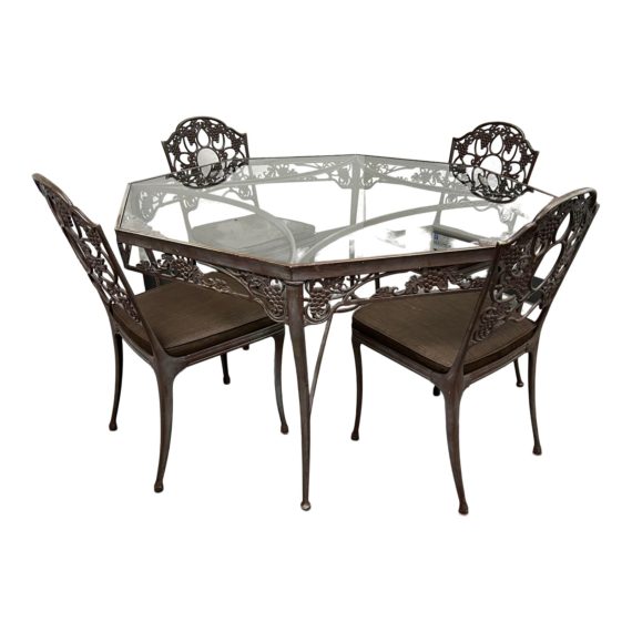 Design Plus Gallery presents Custom Mid Century Dining Set. Intricately cast aluminum details remain in the original finish, with lovely pantina (never painted). The Glass Top Hexagon Table is a perfect scale. The four roomy chairs are recently upholstered in brown Sunbrella fabric which makes it luxurious spending time outdoors or indoors(!) with friends and family.