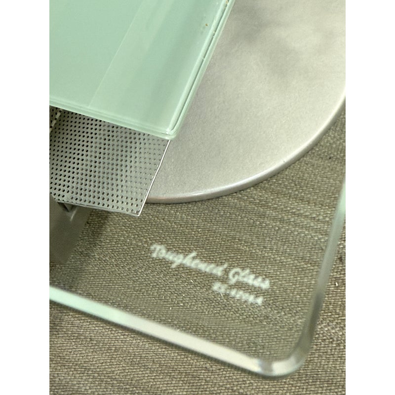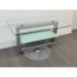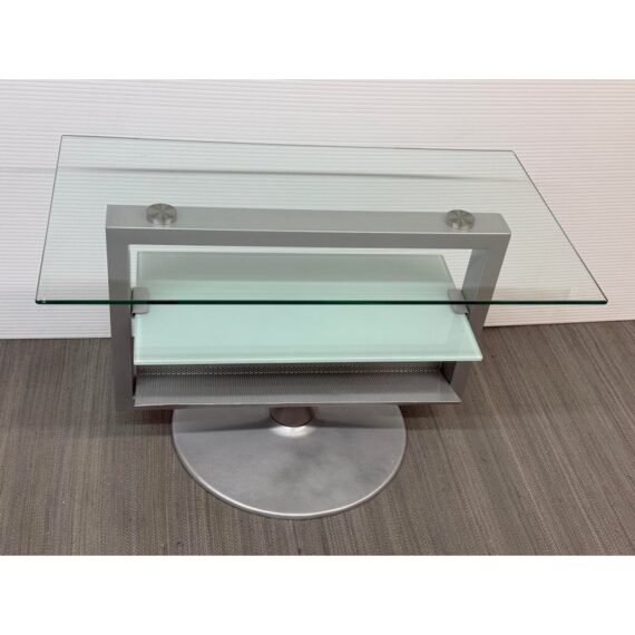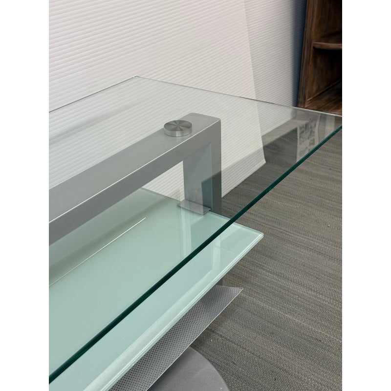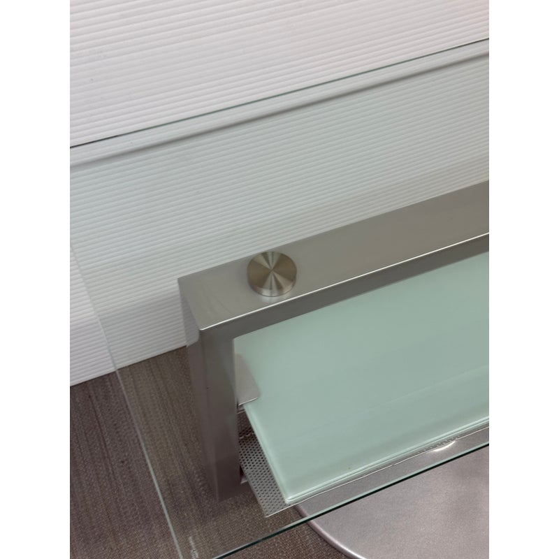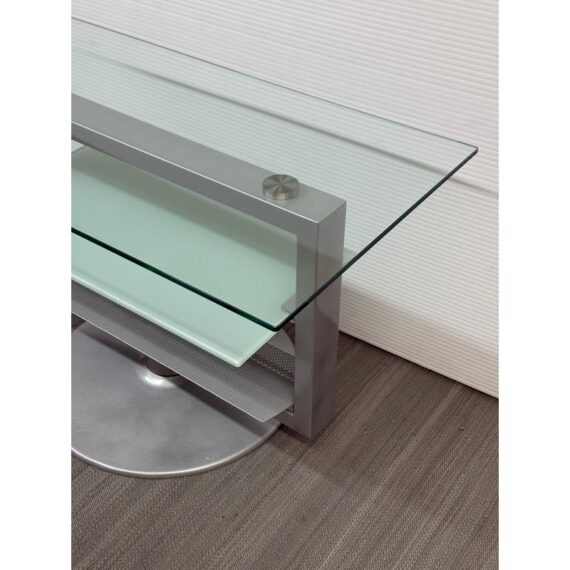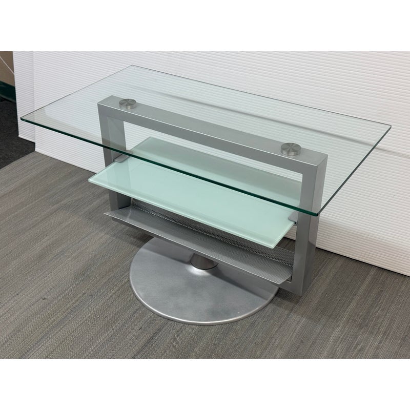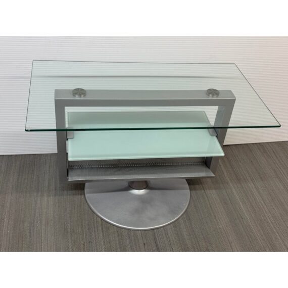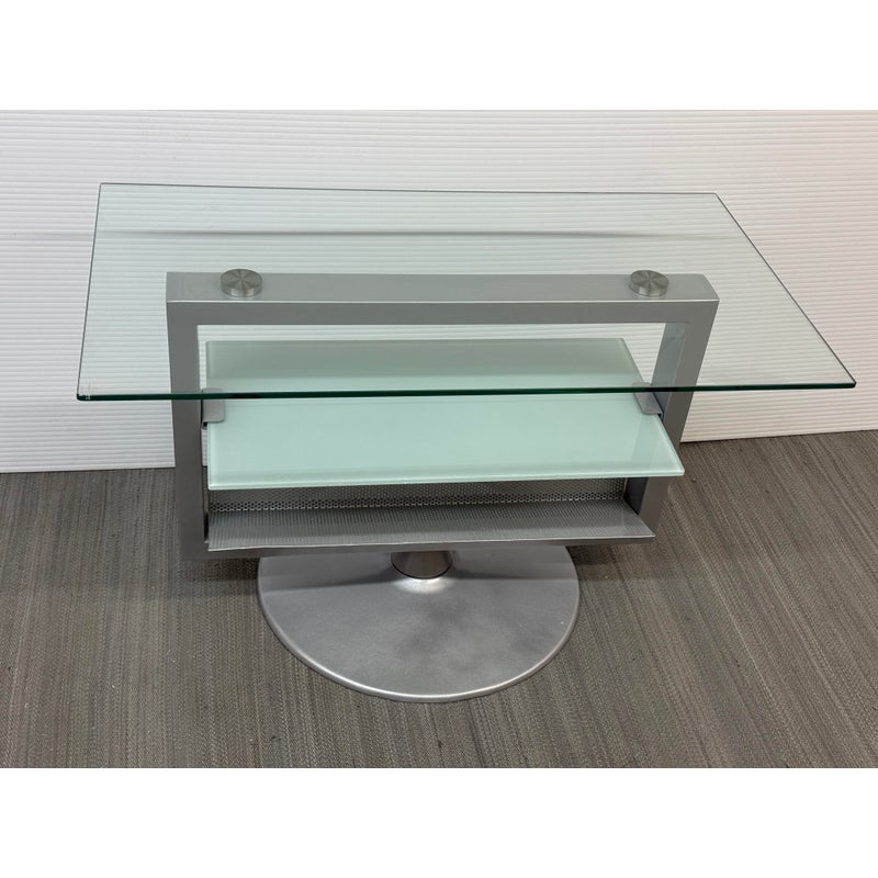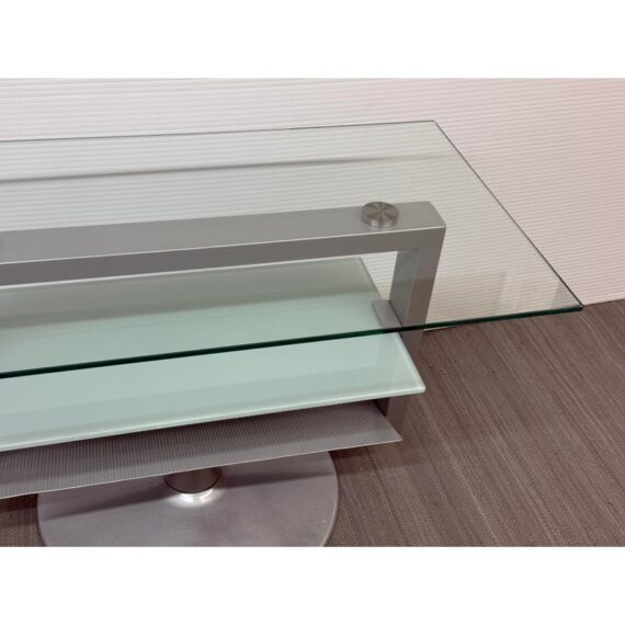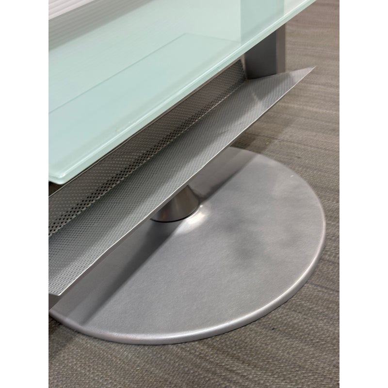 Design Plus Gallery presents an Amalfi Swivel Media Stand. The media stand is a modern combination of glass and steel and offers an expanse for your television and smaller shelves for components of necessity. The console does a full swivels for easy viewing wherever you may be. The style has been discontinued by the brand. Light surface wear; condition is good.