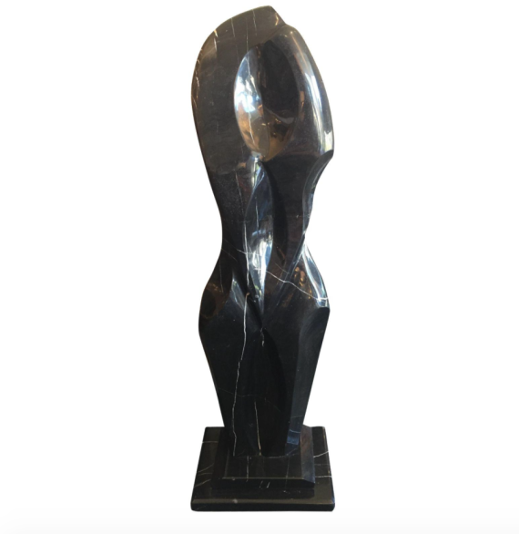 Lovers embrace captured in deeply veined Monterey black marble by Mexican artist Camarena. Large in size but still in spirit.
