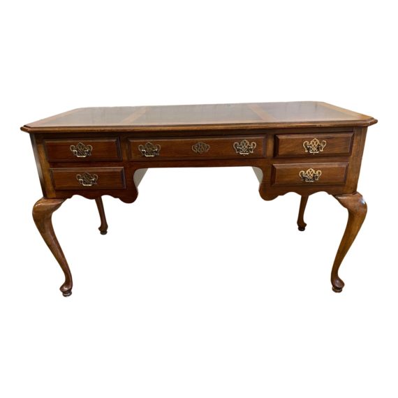 Design Plus Gallery presents an American Drew Cabriole leg + Blotter Writing Desk. Milled of solid oak with Chestnut stain. Interior compartments made of pine. Comes with five small drawers. Curved base continuers into the apron around the storage. Fully finished on all sides. Would float beautifully in the middle of a room. top is inlayed with contrasting stains to reference and English and European elegance. Oiled brass hardware completes the look. Minor wear on surfaces.