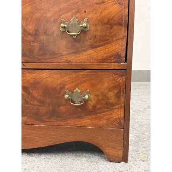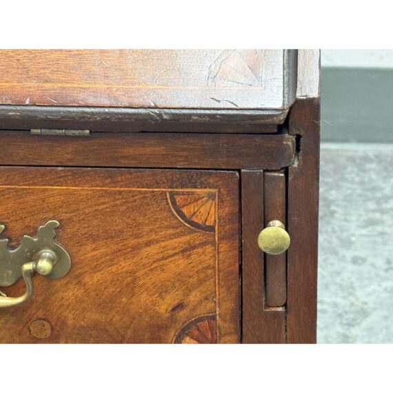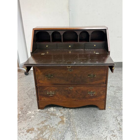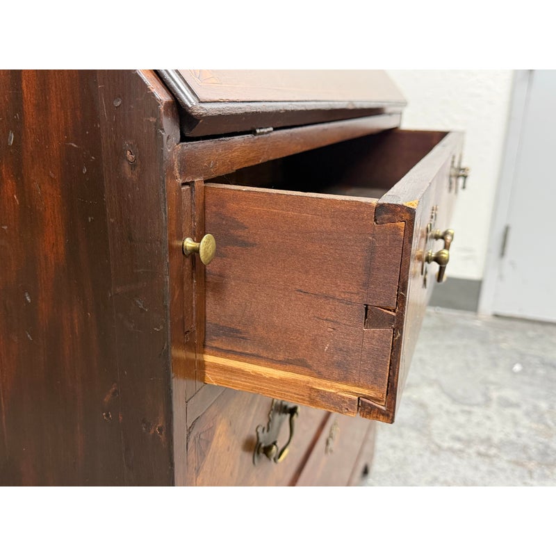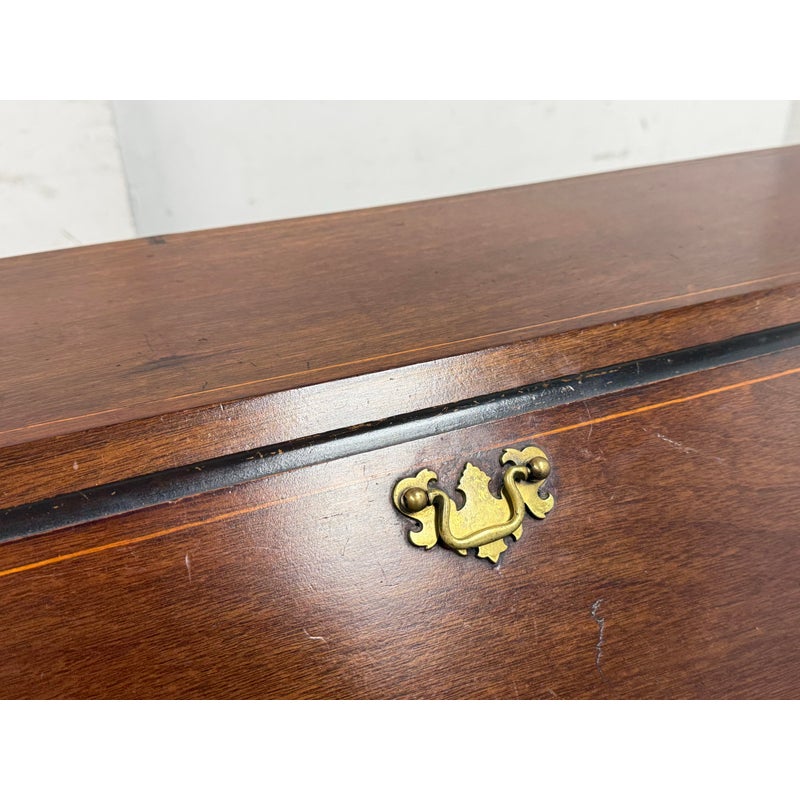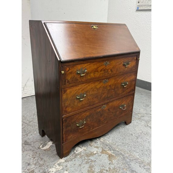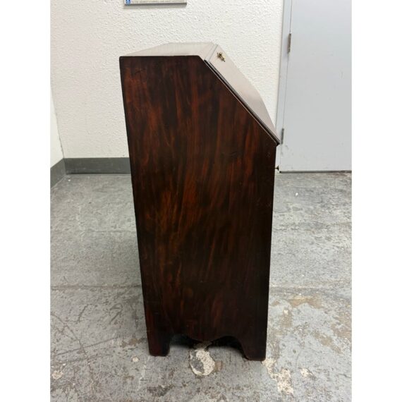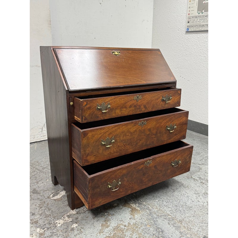 Design Plus Gallery presents a Chippendale Style Slant Front Secretary of Vintage to Antique Age. The desk has mahogany veneer, white pine and poplar with a dovetailed case, slanted lid with banded veneer, lopper support, interior with prospect door, and various other elements to store your stationary, mail and writing instruments. In good vintage condition, visible scratches and wear from heavy usage. Does not come with a key.