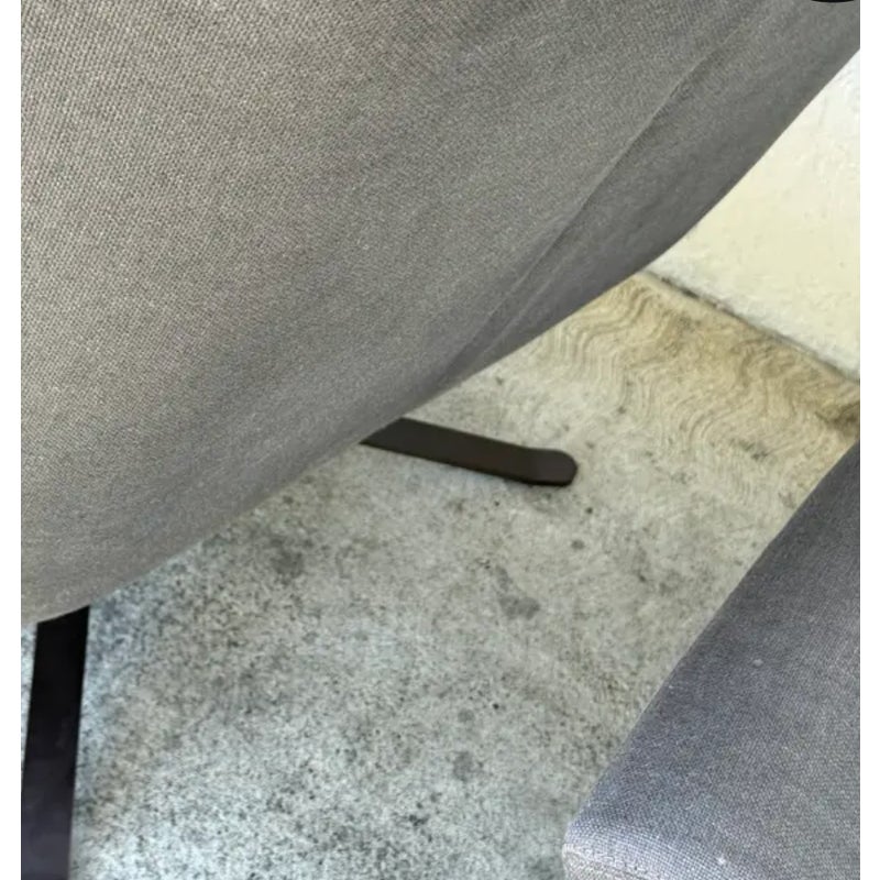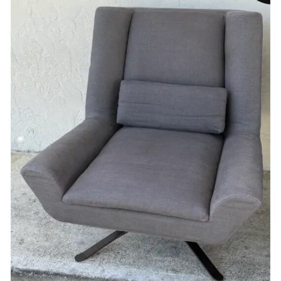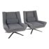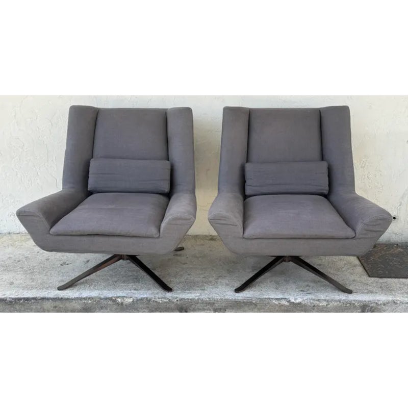 Design Plus Gallery presents a Pair of Luke Upholstered Swivel Chairs. Hand assembled by master craftsmen in North America. A discreet metal base anchors the swivel chair, an inspired take on the modern forms of 1970s Italian design. Sophisticated and supportive both, its contoured back, flared arms and lumbar pillow offer a singular embrace. In good condition, visible and minimal wear form usage. Made in USA.