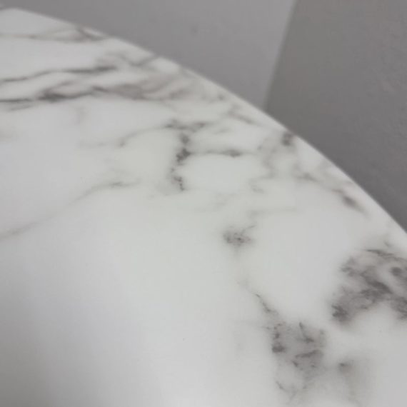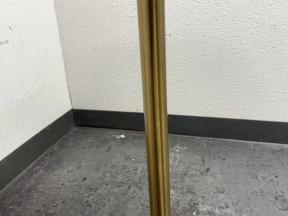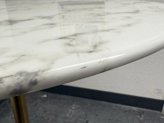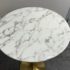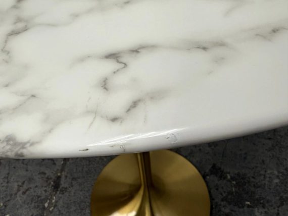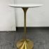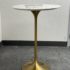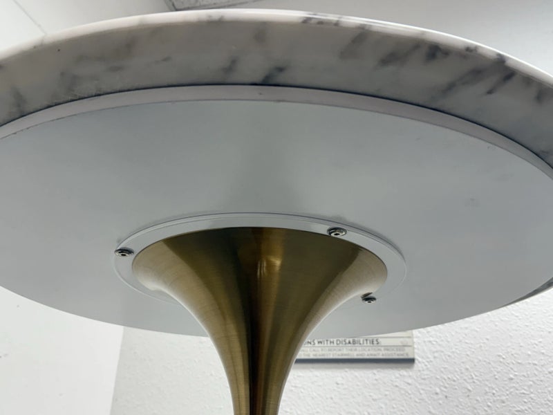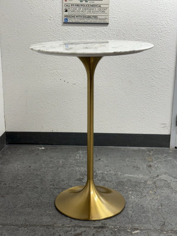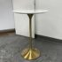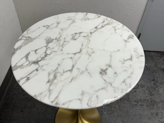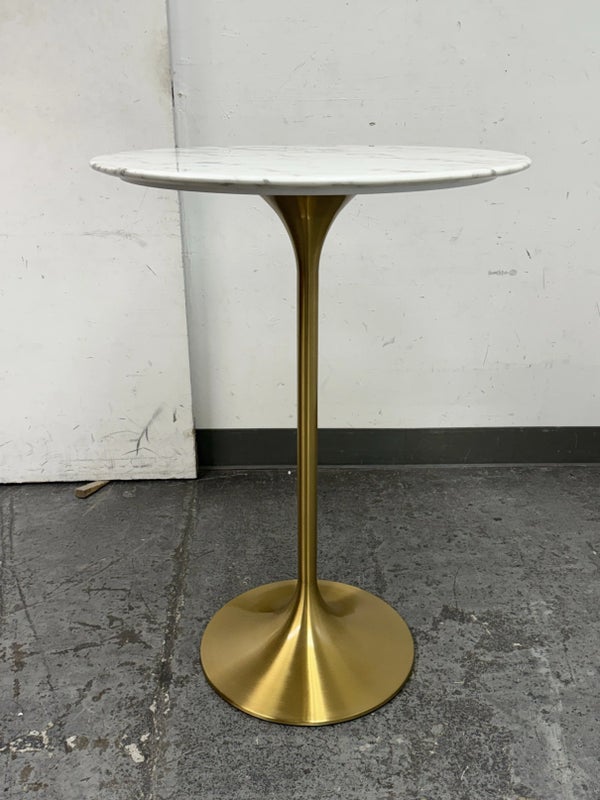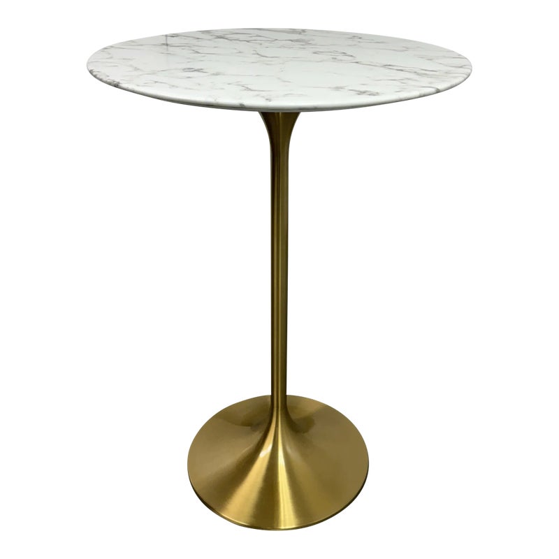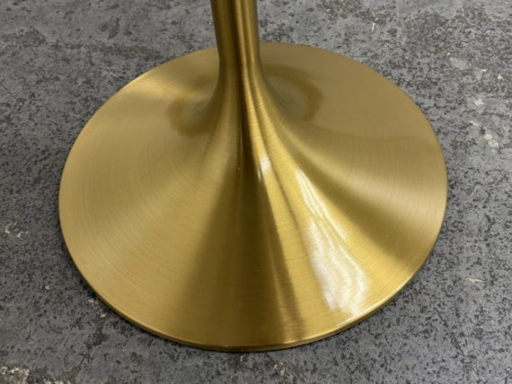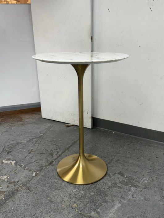 Design Plus Gallery presents a Brass Tulip Base Pub Table from American Luxury. Has a seamless organic shape and timeless form with luxurious looking textiles. Slim base with the beloved tulip design allowing for less space to be taken up in order to safe space. The table top is marble resin surface with minimal signs of wear that is consistent with its usage.