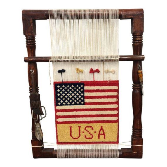 Design Plus Gallery presents a unique weaving. This piece of Americana will make a statement in any room. It has been left on the loom and unfinished on purpose. It makes a great piece of wall Art.