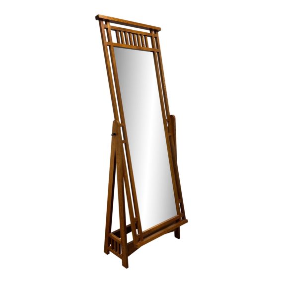 Design Plus Gallery presents a Cheval Standing Full Length Mirror. Both functional and stylish, adding a touch of elegance to your space. Whether you need a last-minute outfit check or simply want to enhance the natural light in your room, this mirror is a must-have accessory. The classic Mission slat design is timeless and complements any decor style, from traditional to modern. The versatility of this mirror is unmatched, thanks to its adjustable pivot feature. You can easily tilt the mirror to get the perfect angle for your reflection. Crafted from high-quality solid wood, the frame of the Cheval Standing Full Length Mirror is built to last. The sturdy leg base ensures stability, so you can tilt the mirror with confidence, knowing it won’t tip over. Is in good condition with minimal signs of wear + tear.