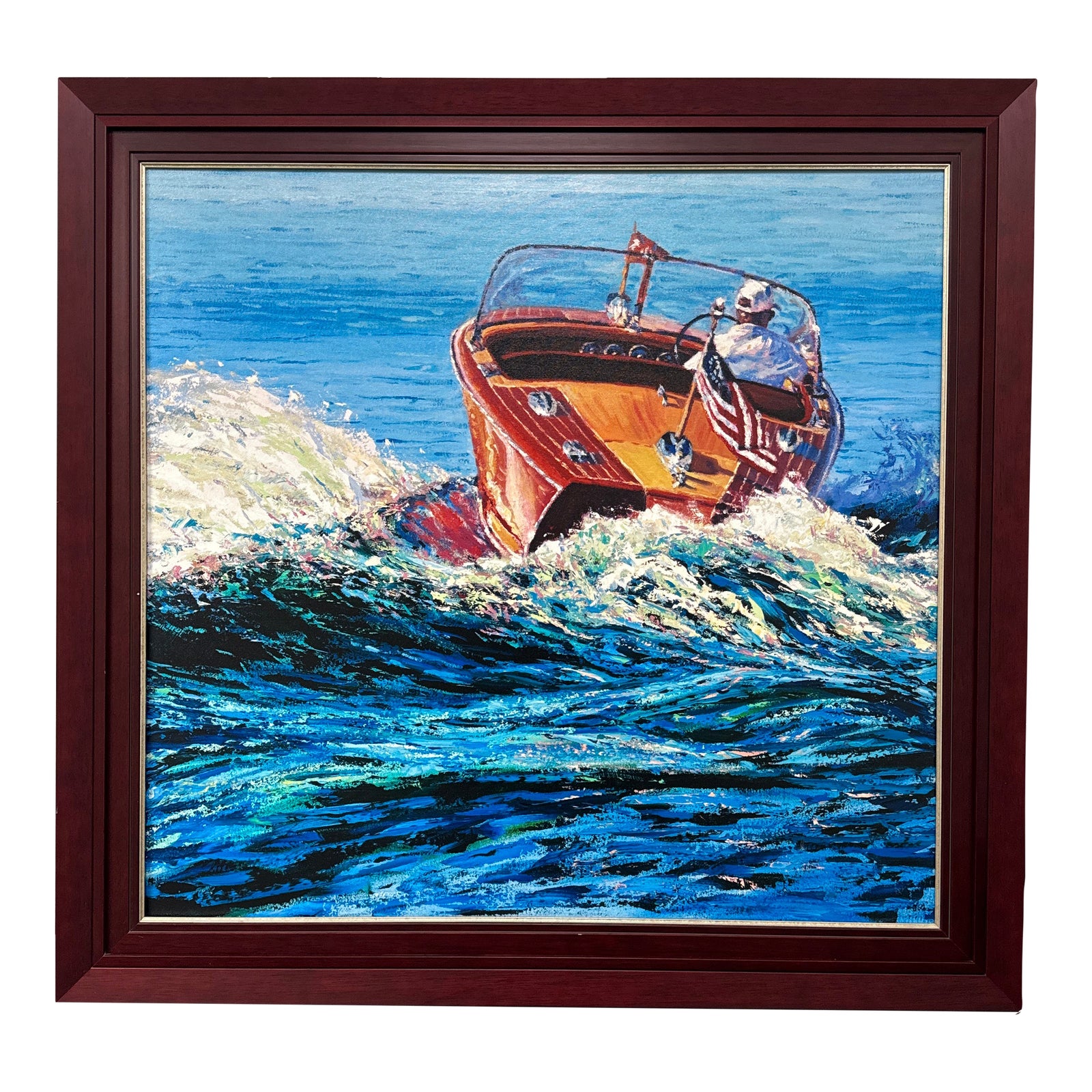Design Plus Gallery presents a Framed Print by Andrew Bolam. Vibrant colors, dockside perspective and playful movement go into this boater’s dream scenario, speeding across the alpine waters of Lake Tahoe, bedecked with an American Flag. Little wear; condition is consistent with age and use.