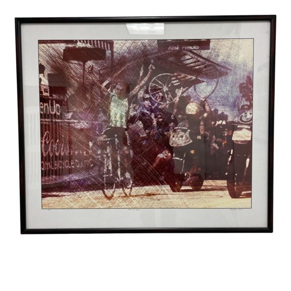 Design Plus Gallery presents a Framed Andrew Carson Bike Race Photo. Signed and dated by the artist on the lower right corner of the matte. A bicyclist crossing the finish line flanked by by a cheering crowd and motorcyclists is finished with a rustic filter. Photo conveys the action and energy of the moment. Framed with simple and contemporary black metal. Minor wear.
