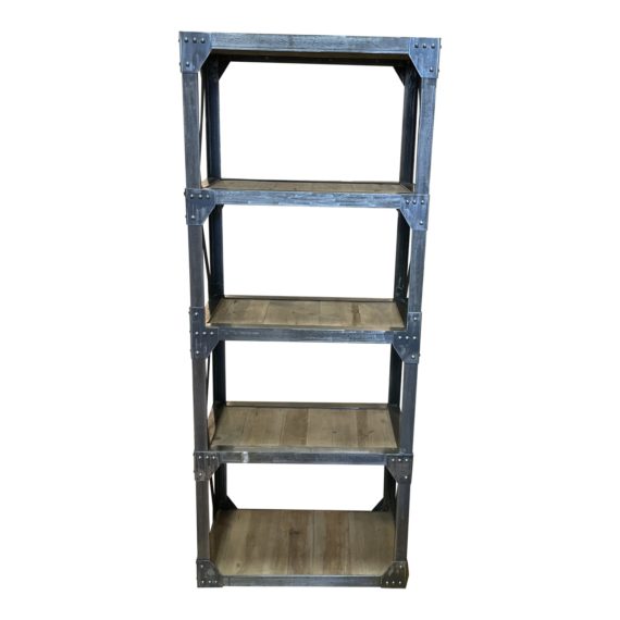 Design Plus Gallery presents a Bookcase by Andrew Martin Industrial Bookcase Etagere. Antiqued metal frame complete with grommets are richly juxtaposed with reclaimed planks of wood for the shelving which is nicely deep and generous for styling and storing. Minor wear through out, bookcase is in good condition.