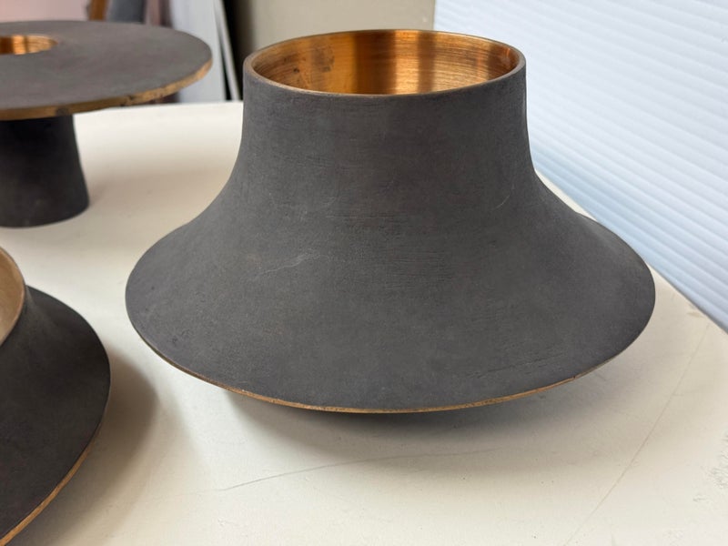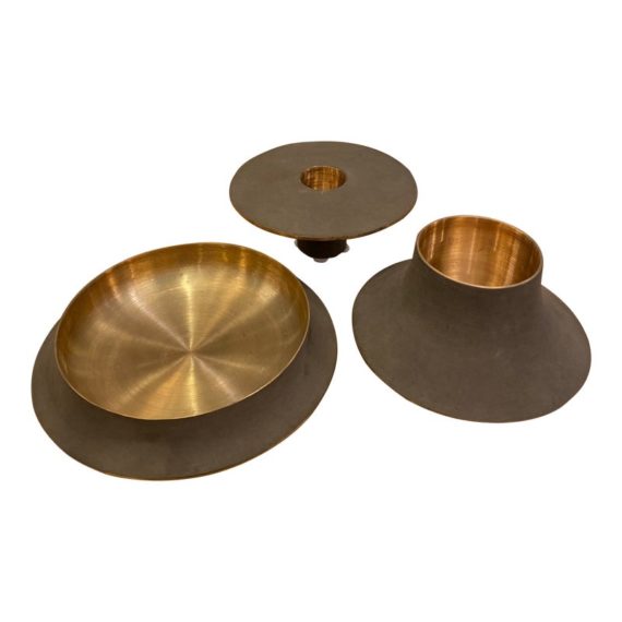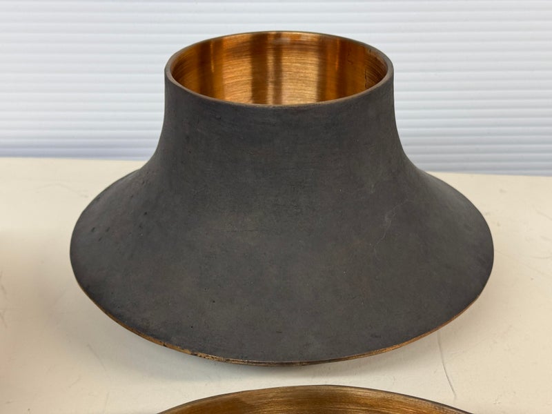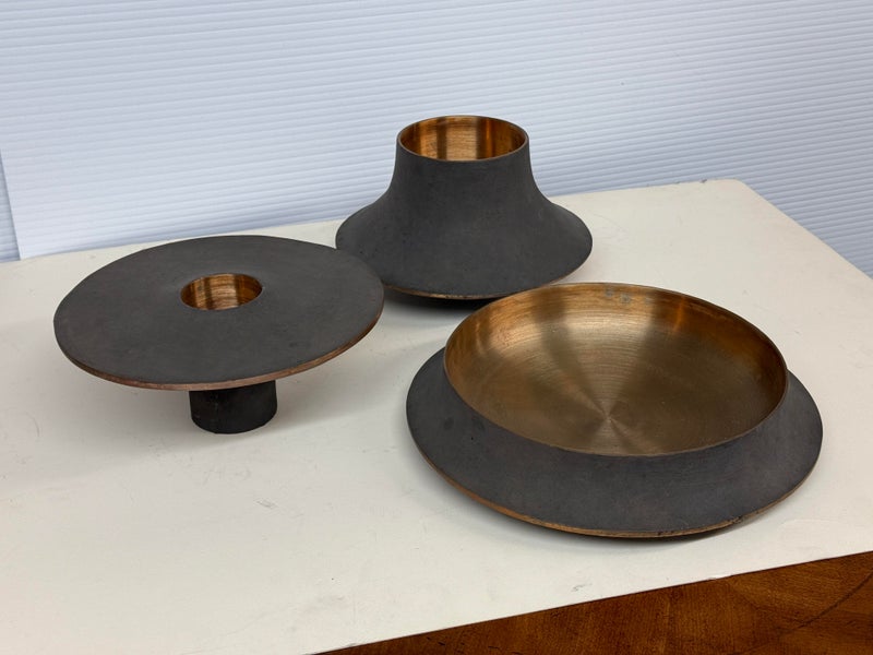 Design Plus Gallery presents a Limited Edition Set of Three Cap53 Bronze Vases by Angelo Mangiarotti for AgapeCasa. Cap53, designed by Angelo Mangiarotti for AgapeCasa, are vases made from bronze casting using a lost-wax mold, with external surfaces treated with a hot-applied silver nitrate patina and polished internal surface and edges. The interaction of fluid volumes define this stunning bronze vase set. The addition of silver nitrate creates a characteristic patina that contrasts with the brushed, luminous glow of its interior. In addition to the sale of this set a Certificate of Authenticity and an Artist Book is included. Light pitting is revealed and condition is good, consistent with age and use.